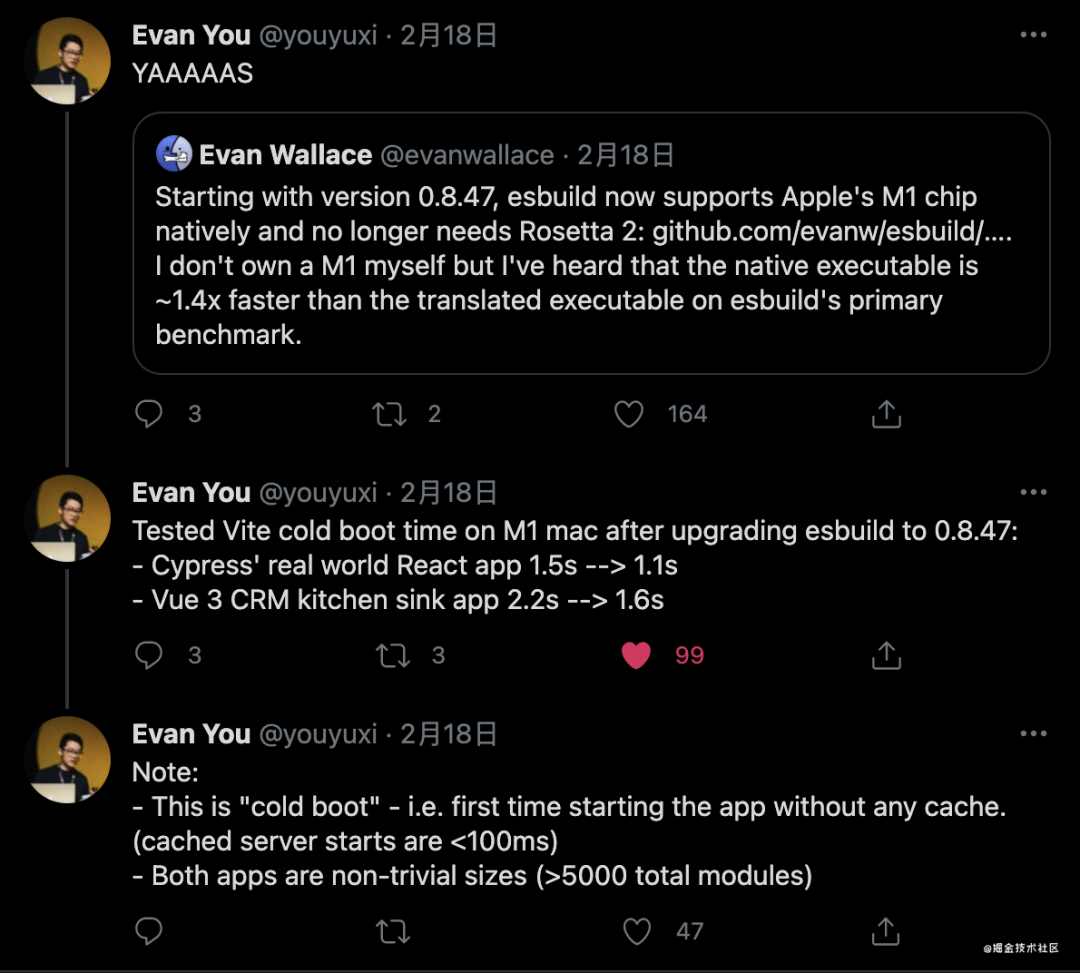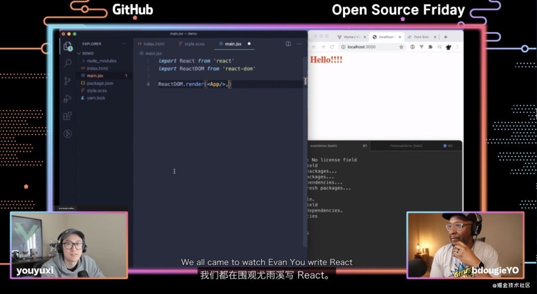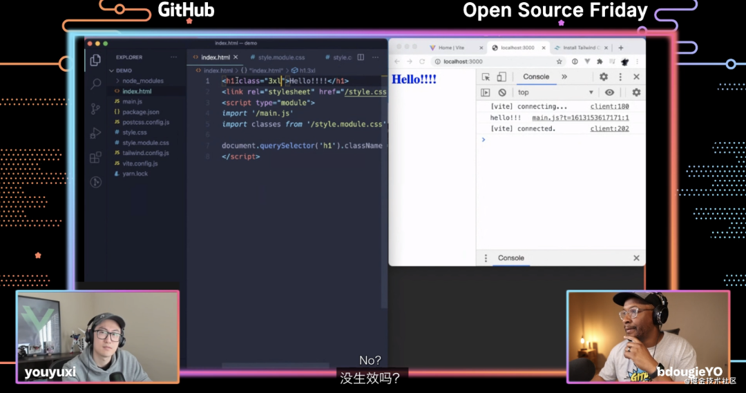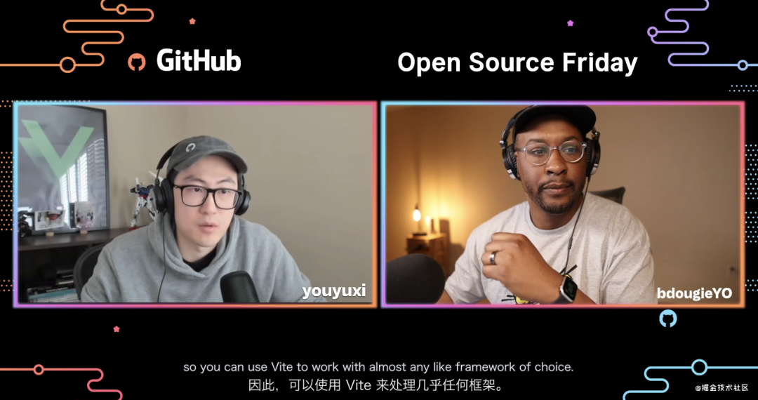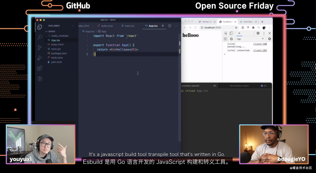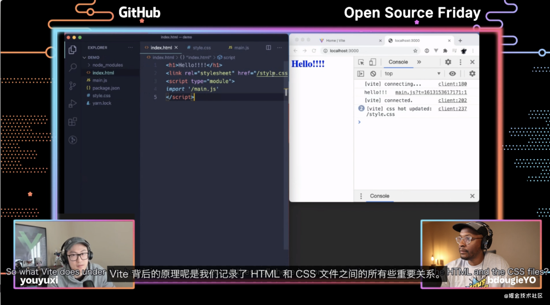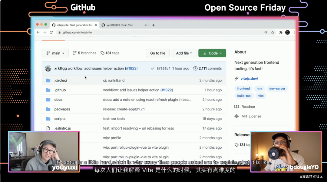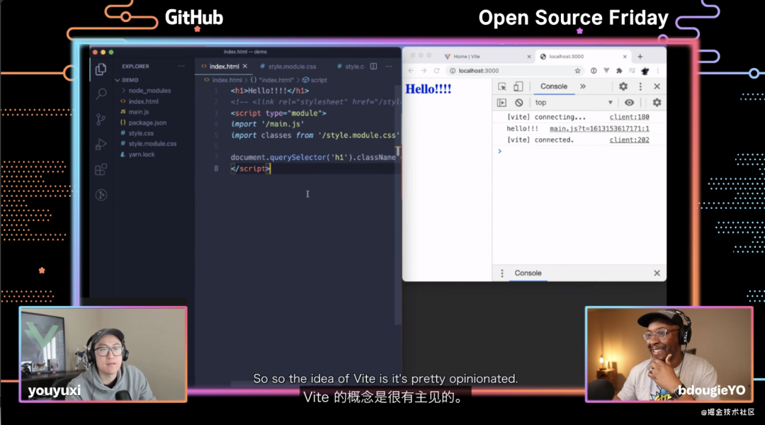 关于 Vite,来看看作者本人怎么说。本视频是 Vue[5] 以及 Vite[6] 作者 尤雨溪[7] 在 2021 年 2 月 12 日在 Twitch[8] 上做客 GitHub Open Source Friday[9] 节目的直播视频。在视频里有尤大关于 Vite 的各项功能的详细阐述、大神在线编码、在线 Debug、大佬 diss webpack 以及对 Vite 的哲学思考。本视频很长,接近 70 分钟,下面是视频摘录,大家可以选择自己感兴趣的点自行传送。强烈建议大家观看视频,里面有很多细节相信大家会有收获。视频地址:【译】下一代前端工具 ViteJS 中英双语字幕 - Open Source Friday[10]