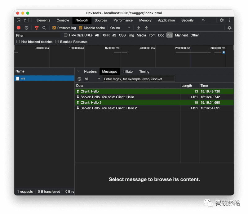 然后,可以通过调用webSocket.send()方法发送消息。你的控制台应该类似于下面的控制台。