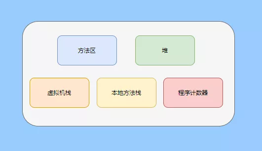 Java 虚拟机运行时数据区分为程序计数器、虚拟机栈、本地方法栈、堆、方法区。