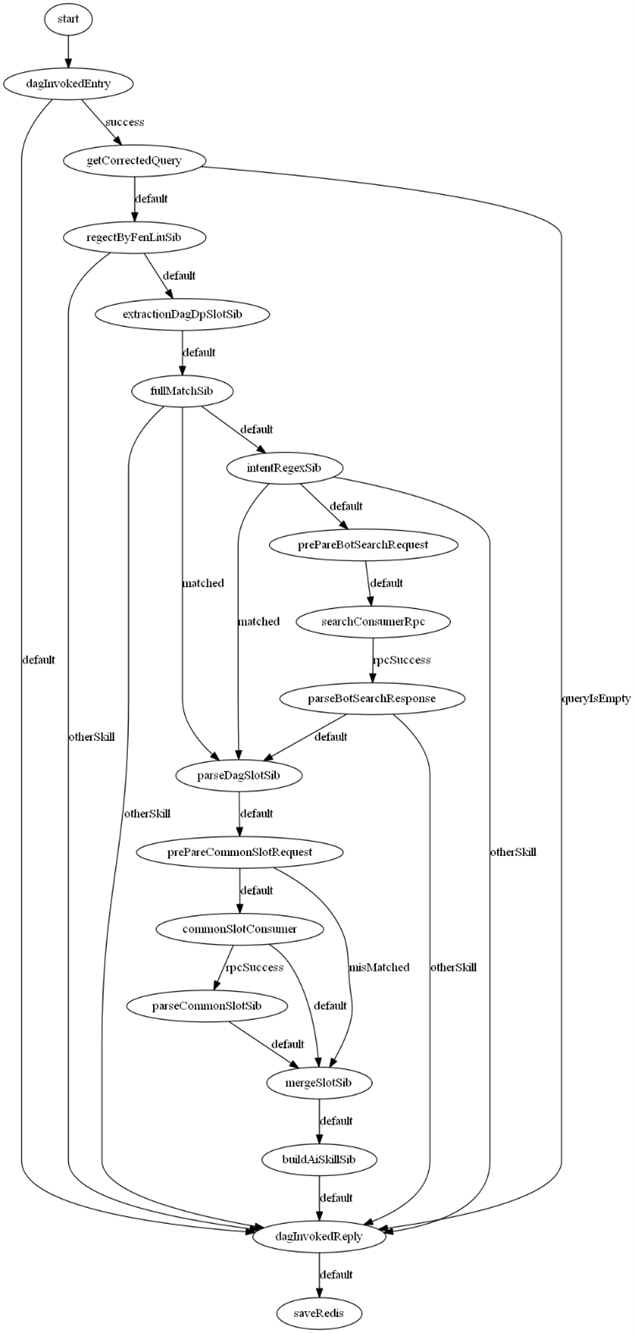 基础类库层负责最底层的能力建设,上层各算子依赖底层基础类库层实现,业务层采用DAG框架将算子组合构建需要执行的流程拓扑图(如下图),快速搭建领域nlu。