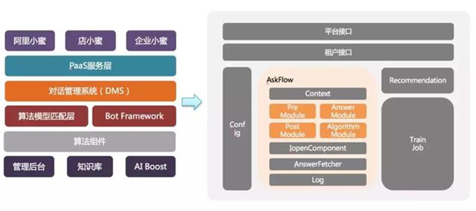 它做到了领域化和平台化,面向阿里生态圈、商家生态圈和企业生态圈支持以PaaS和SaaS输出。模块化整个对话管理和流程模块化,构建算法和业务模块可插拔的并行架构体系。
