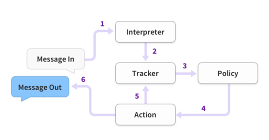Interpreter承担NLU的职责,Tracker+Policy+Action承担DM的职责