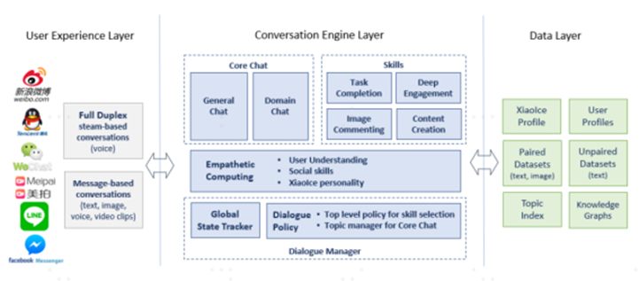下图给出了小冰的整体架构。它包含三层:用户体验层、对话引擎层和数据层。