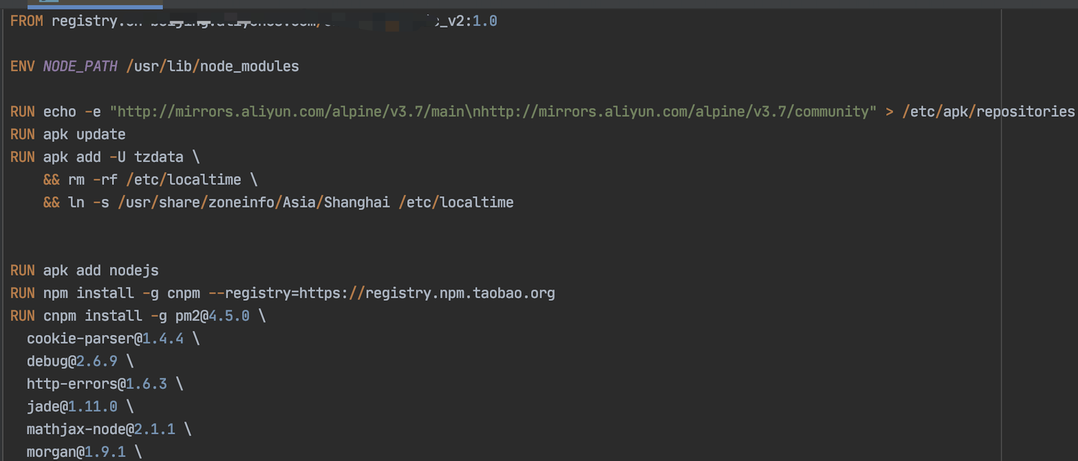 - 项目中使用node全局包,因此需要修改环境变量,命令:ENV NODE_PATH /usr/lib/node_modules