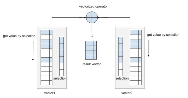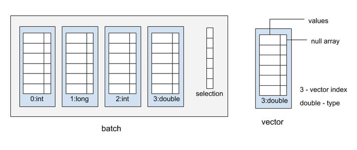向量化表达式执行时,所有的数据都会存放在batch这一数据结构中。batch由许多向量(vector)和一个selection数组而组成。其中,向量vector包括一个存储特定类型的数值列表(values)和一个标识null值位置的null数组组成,它们在内存中都是连续存储的。null数组中的bit位以0和1来区分数值列表中的某个位置是否为空值。