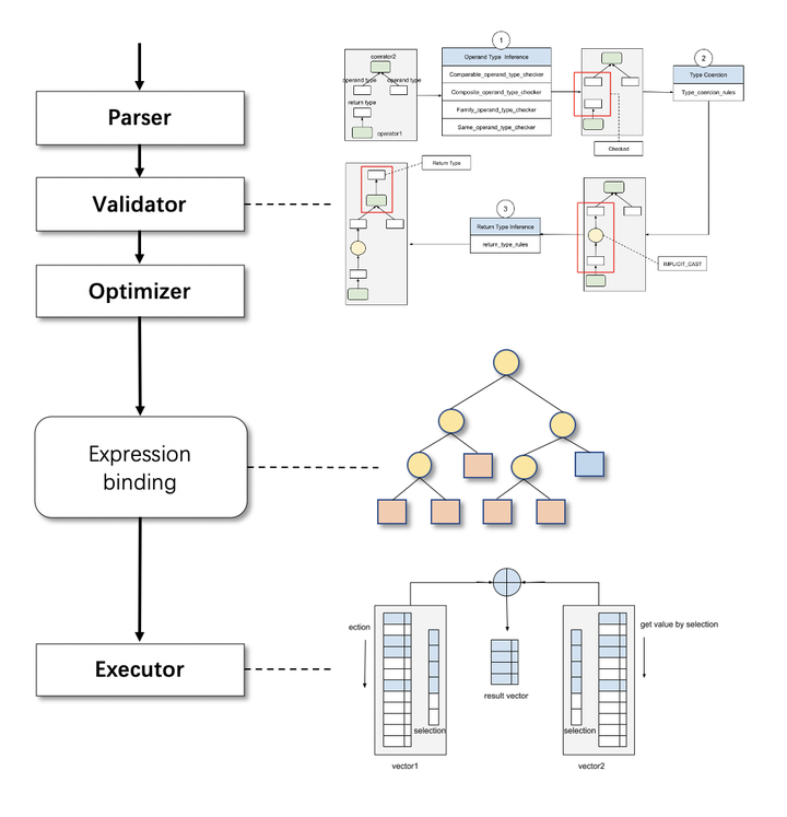 - 用户SQL经解析后,在validator中进行校验,推导和修正表达式的类型信息;这一阶段为向量化运算提供正确的、静态的类型信息;