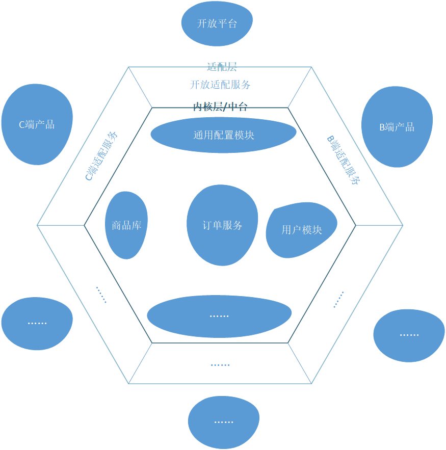 六边形架构又称为端口-适配器架构,从内到外分为:内核层、适配层、接入层。六边形架构和中台架构做对应关系的话,六边形架构的内核层可以比作中台本身,六边形架构的接入层可以认为是中台架构中的上层业务单元,六边形架构的精髓之适配层在中台架构中并没有体现。