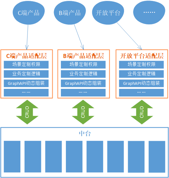 适配层适配业务单元和中台之间的不对等,并且可以做一些权限方面的校验和过滤,中台中的通用服务只需要提供最基本的CRUD功能即可,并且也不需要做大量的权限、业务定制等逻辑,保持中台服务的单纯性,所有的这些差异交给适配服务来搞定。为了快速适配业务层的多变性,适配层的开放API接入GraphAPI能力,做到根据业务层传过来的参数动态组装元数据并返回。
