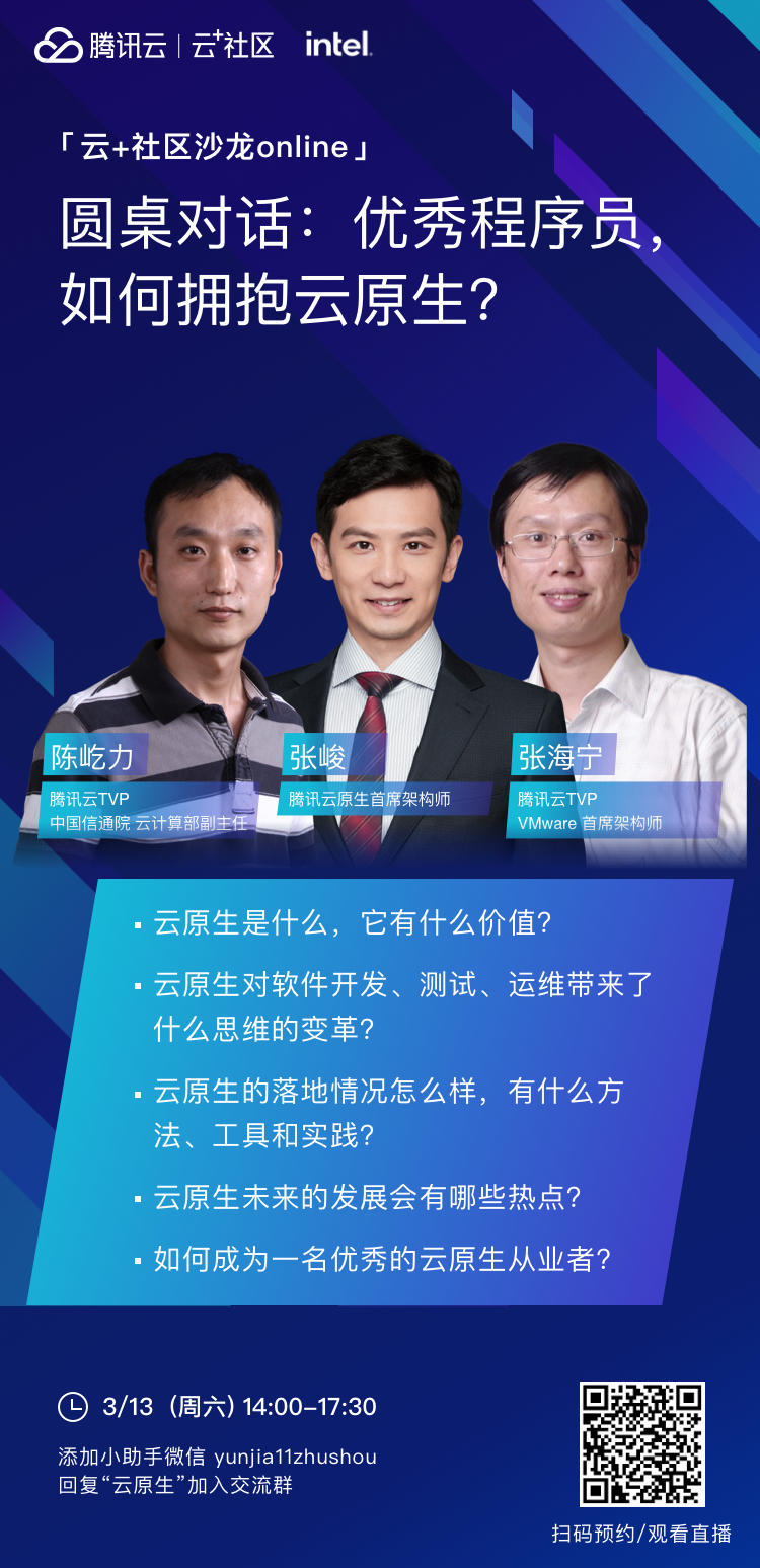 3 月 13 日 14:00-17:30,「云+社区技术沙龙」云原生专场将正式拉开帷幕,腾讯云 TVP、中国信通院云计算部副主任陈屹力,腾讯云原生首席架构师张峻,腾讯云 TVP、VMware 首席架构师张海宁将共聚圆桌对话《优秀程序员,如何拥抱云原生?》内容涵盖:
