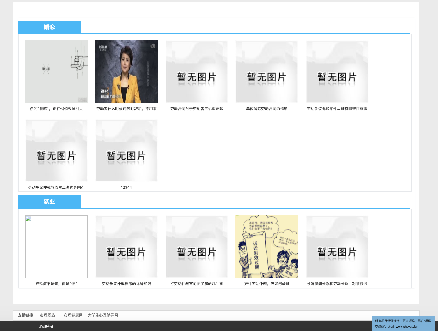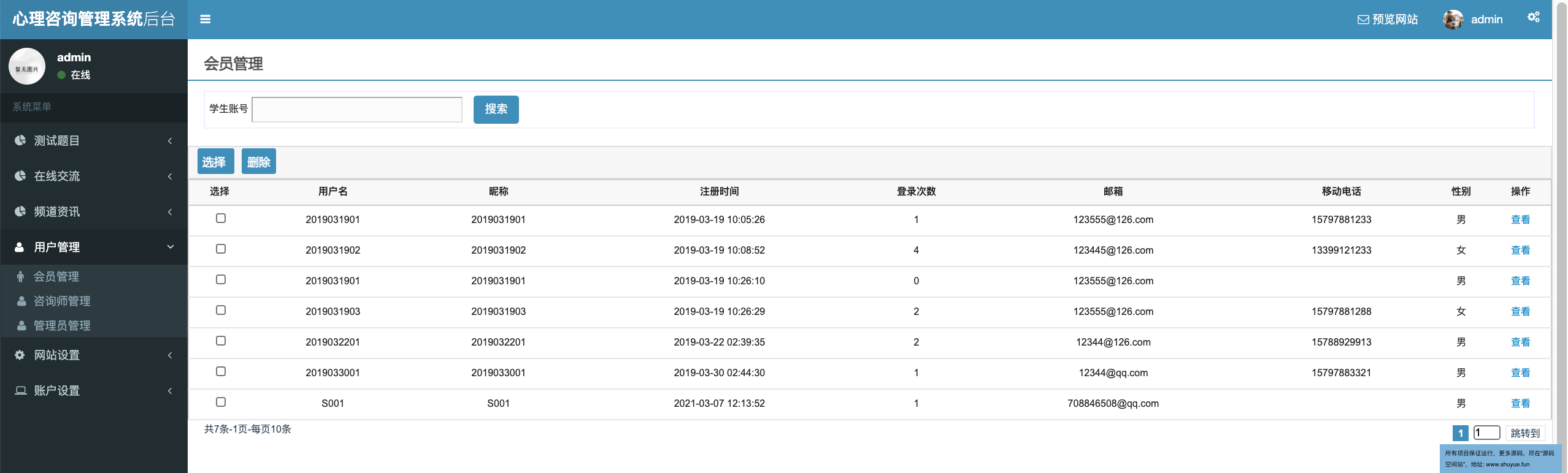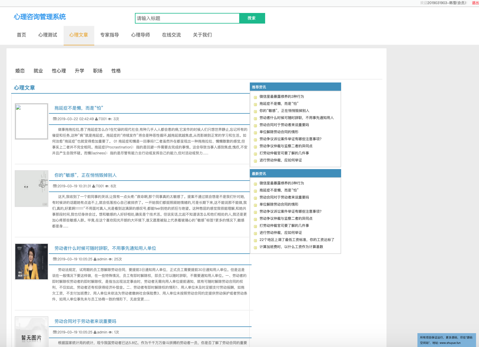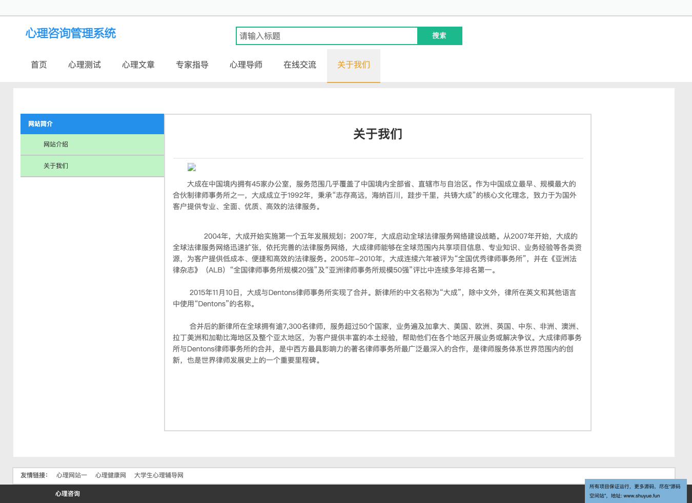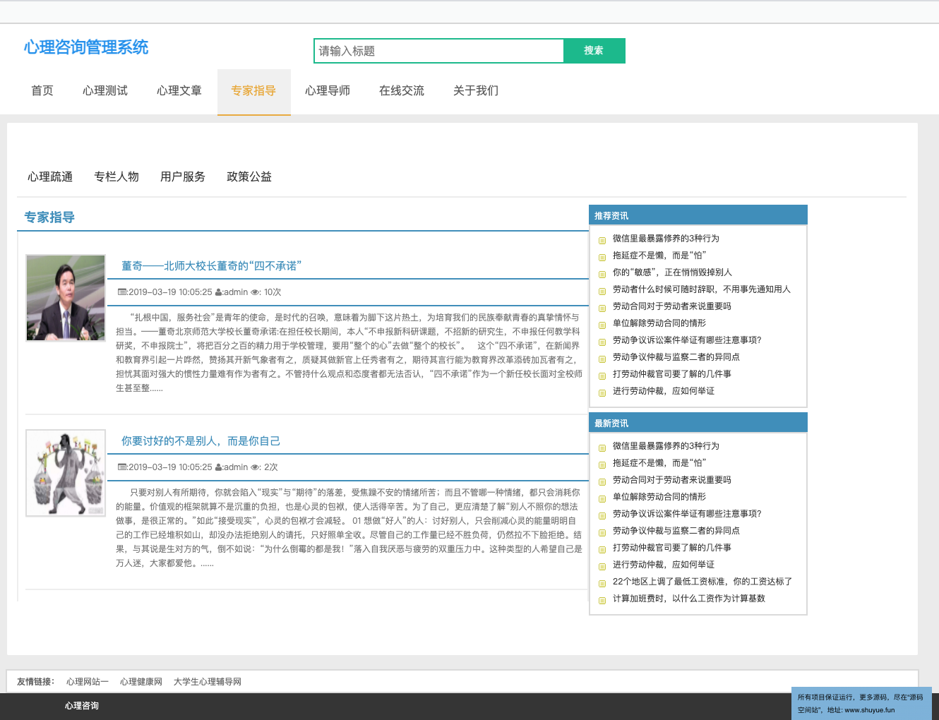 基于SSM校园心理咨询服务平台系统分为学生、教师、管理员三种角色,用户角色主要包括用户注册、用户登录、在线咨询、心理测试、论坛交流、账户维护等,教师角色主要包括教师登录、文章管理、在线回复等;管理员角色主要包括学生管理、教师管理、试题库管理、测试分类管理、试卷管理、新闻管理、网站介绍管理、会员评论管理、轮播图管理、友情链接管理、后台用户管理等最后根据详细设计的结果,运用JavaEE技术平台,使用更灵活的B/S开发模式和经典的SSM组合框架实现系统的MVC分层架构,并结合MySQL数据库实现了大学生心理减压网站的信息化管理。