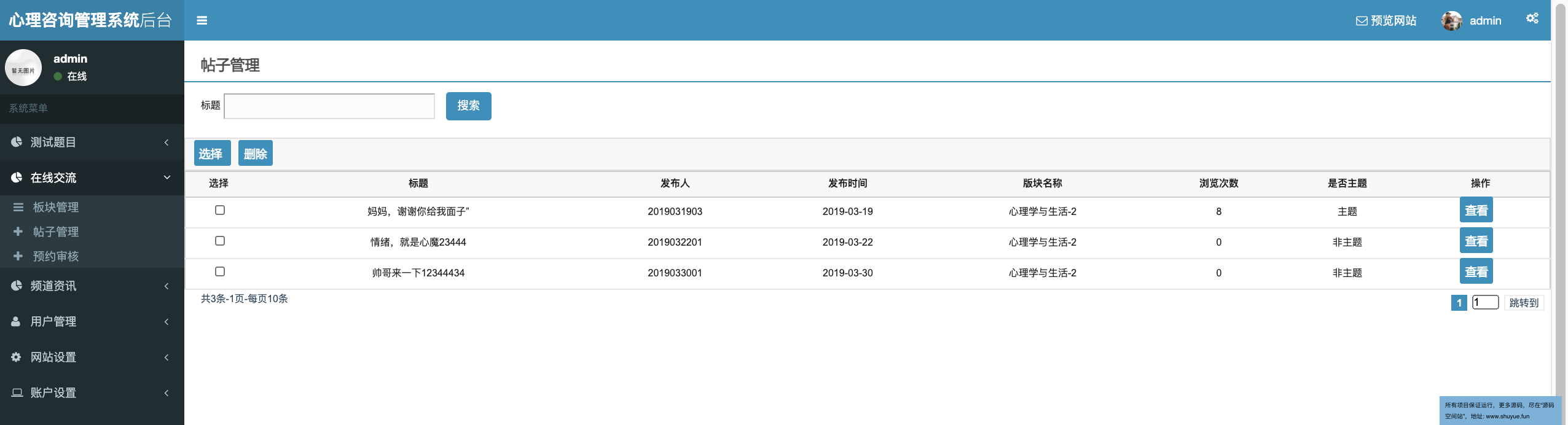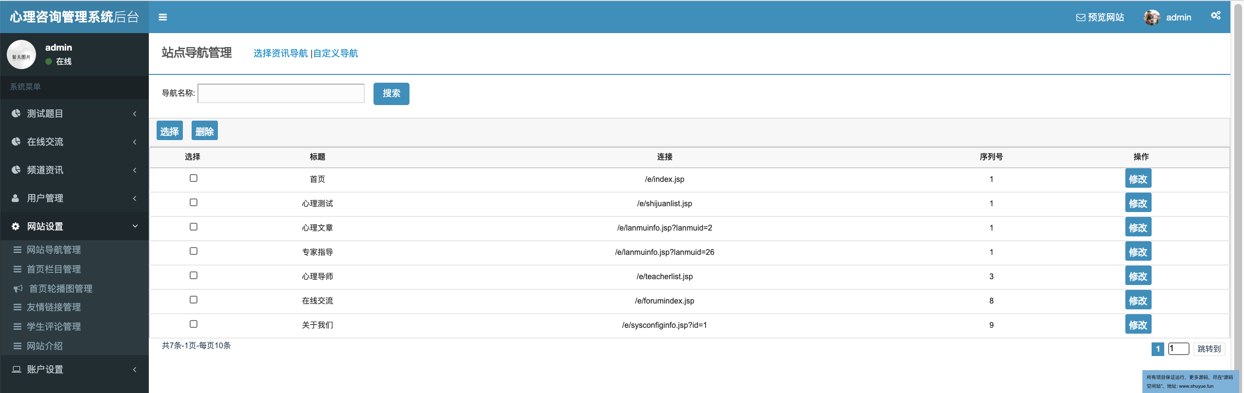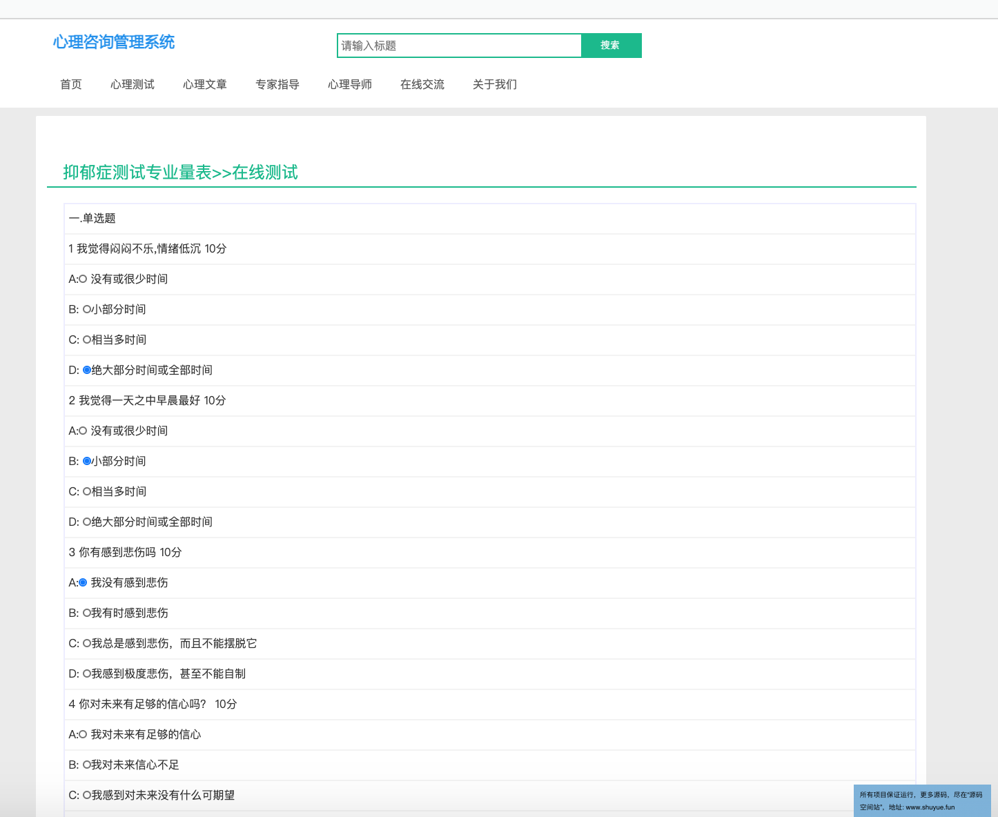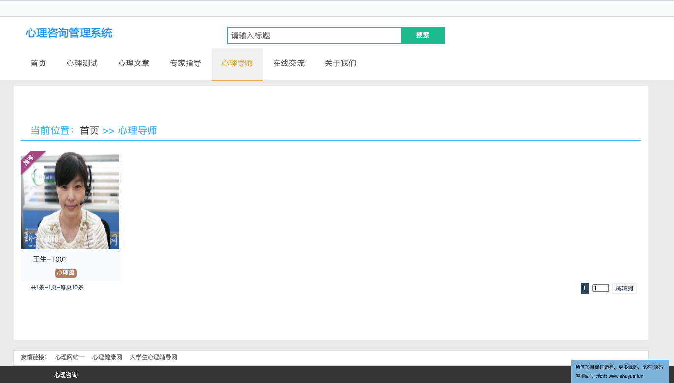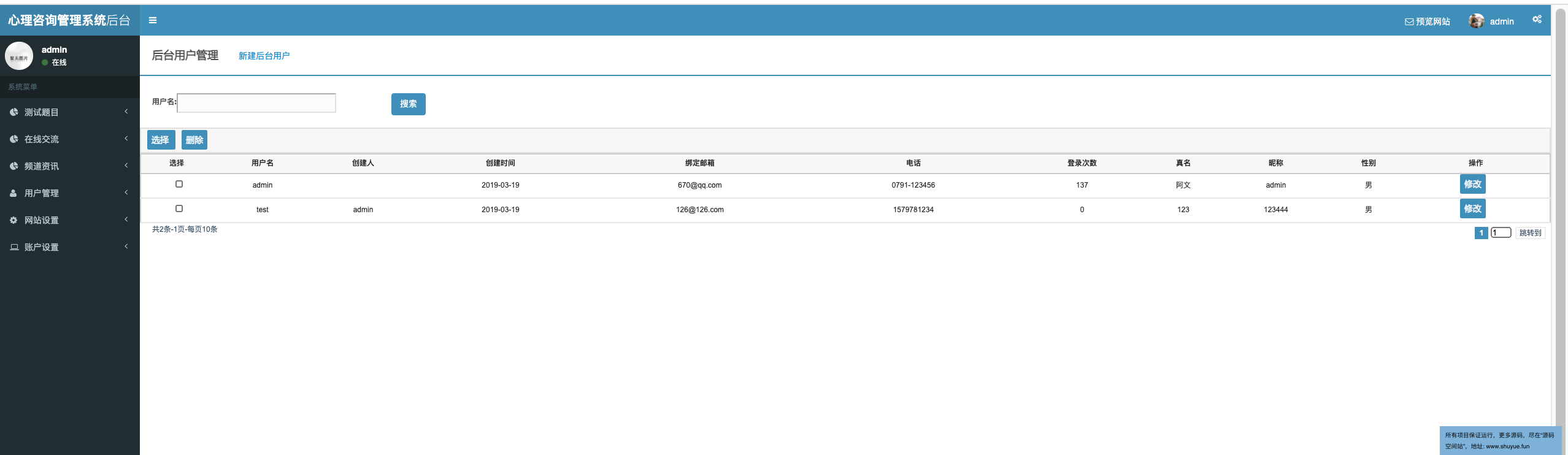 基于SSM校园心理咨询服务平台系统分为学生、教师、管理员三种角色,用户角色主要包括用户注册、用户登录、在线咨询、心理测试、论坛交流、账户维护等,教师角色主要包括教师登录、文章管理、在线回复等;管理员角色主要包括学生管理、教师管理、试题库管理、测试分类管理、试卷管理、新闻管理、网站介绍管理、会员评论管理、轮播图管理、友情链接管理、后台用户管理等最后根据详细设计的结果,运用JavaEE技术平台,使用更灵活的B/S开发模式和经典的SSM组合框架实现系统的MVC分层架构,并结合MySQL数据库实现了大学生心理减压网站的信息化管理。