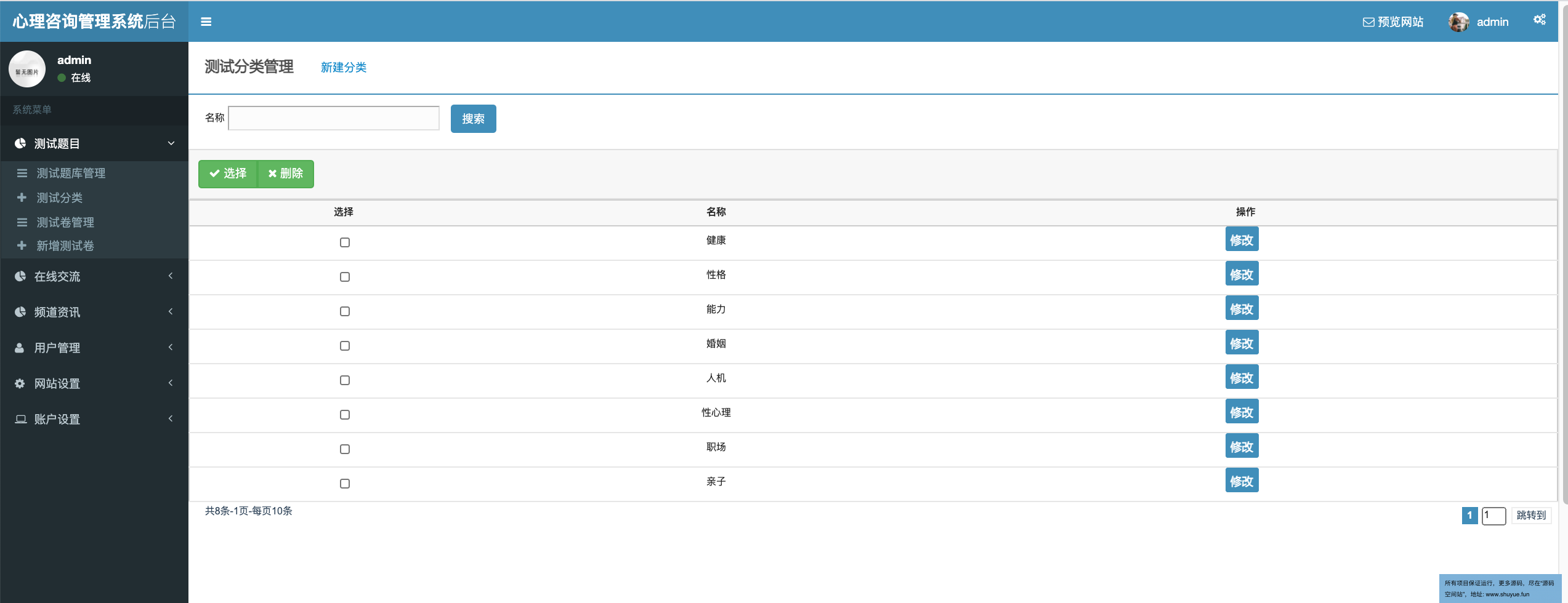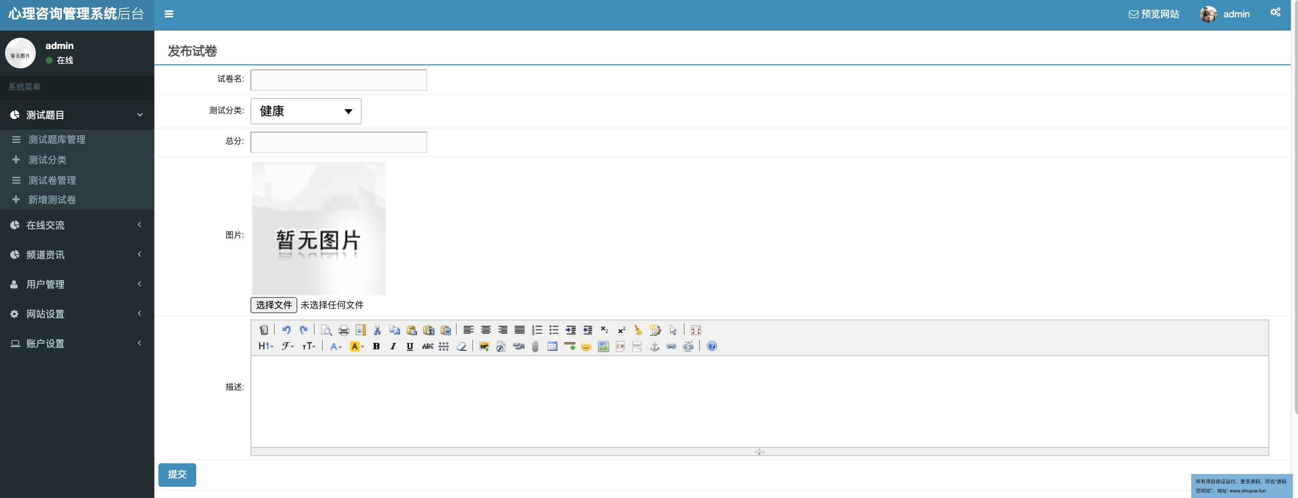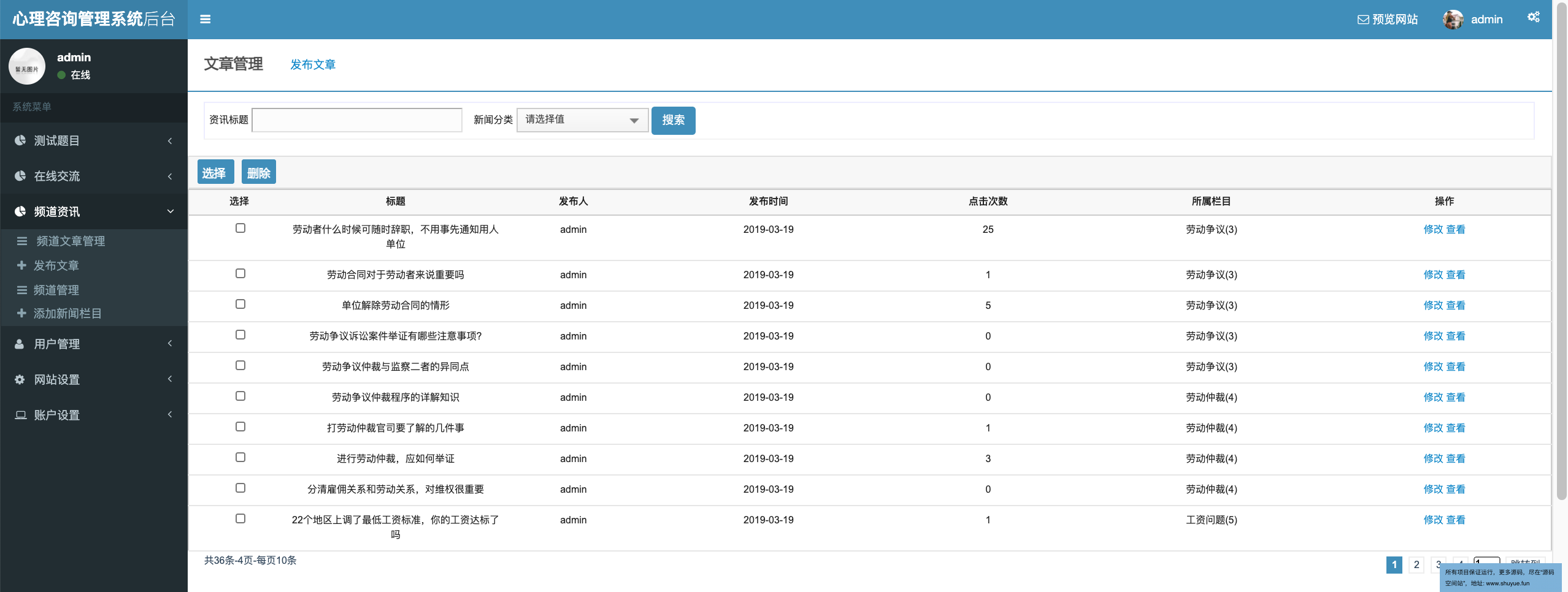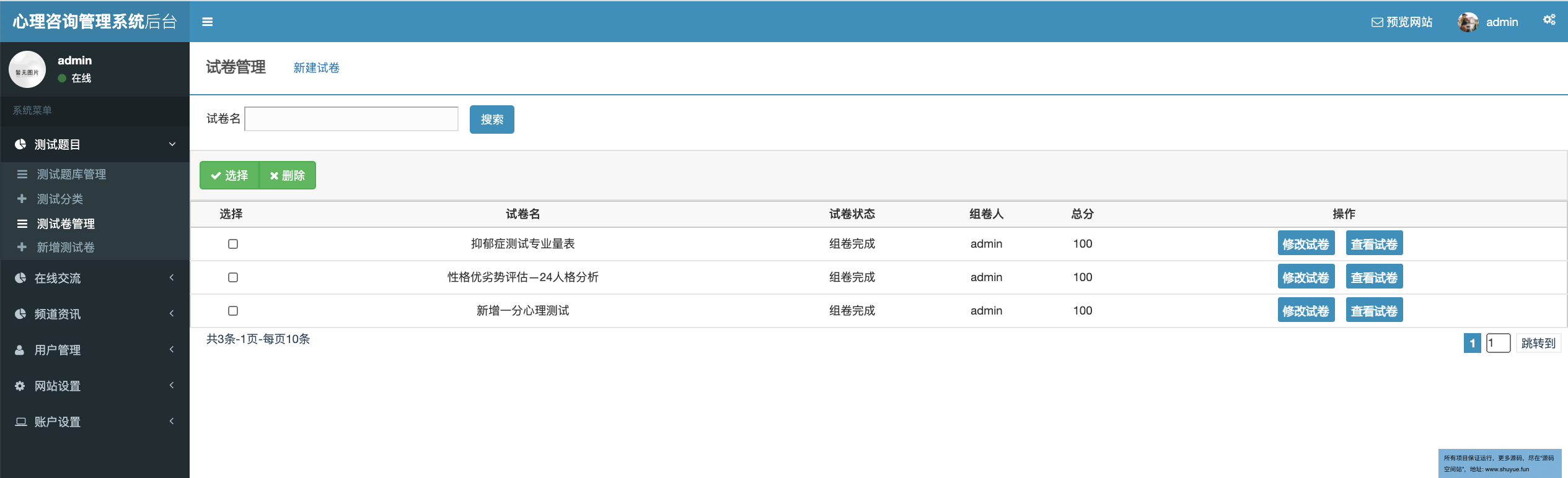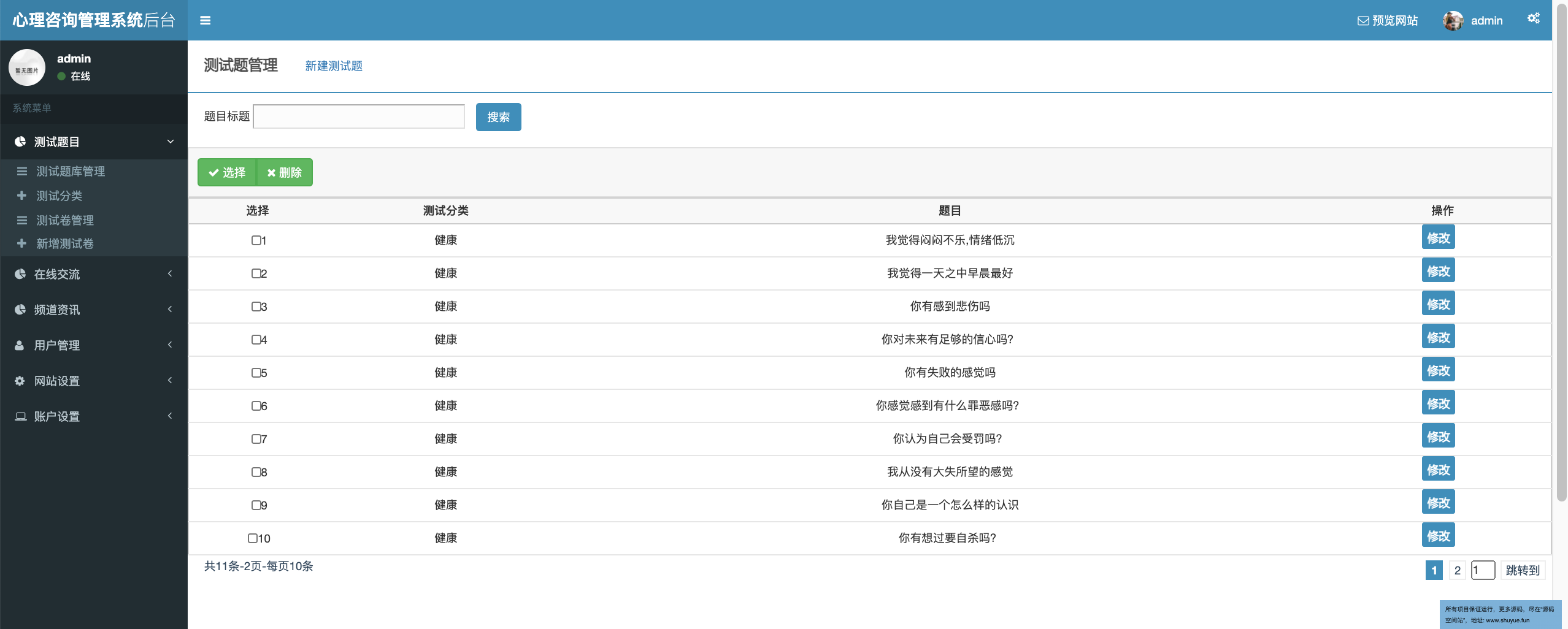 基于SSM校园心理咨询服务平台系统分为学生、教师、管理员三种角色,用户角色主要包括用户注册、用户登录、在线咨询、心理测试、论坛交流、账户维护等,教师角色主要包括教师登录、文章管理、在线回复等;管理员角色主要包括学生管理、教师管理、试题库管理、测试分类管理、试卷管理、新闻管理、网站介绍管理、会员评论管理、轮播图管理、友情链接管理、后台用户管理等最后根据详细设计的结果,运用JavaEE技术平台,使用更灵活的B/S开发模式和经典的SSM组合框架实现系统的MVC分层架构,并结合MySQL数据库实现了大学生心理减压网站的信息化管理。
