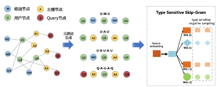 然后,基于飞桨图学习框架 PGL对图模型进行训练。先采用 DeepWalk、Metapath2Vec、GraphSage等模型学习出足够强大的Graph Embedding表示来建模实体ID;再通过向量召回,将用户在歌曲、Query等处的行为迁移到主播领域,达到召回合适主播的目的。