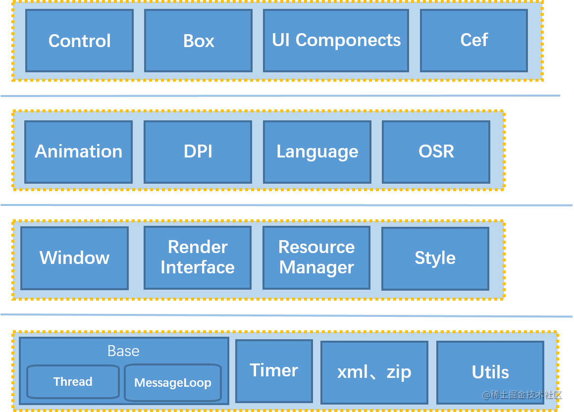 网易 Duilib 使用 C++11 重写,在其原有基础上做了较大重构,搭配谷歌的基础组件 Base 库、基于 Chromium 的 WebView 框架 CEF 以及常用的 UI 组件,形成了一套功能强大、简单易用的完整桌面 UI 开发框架。