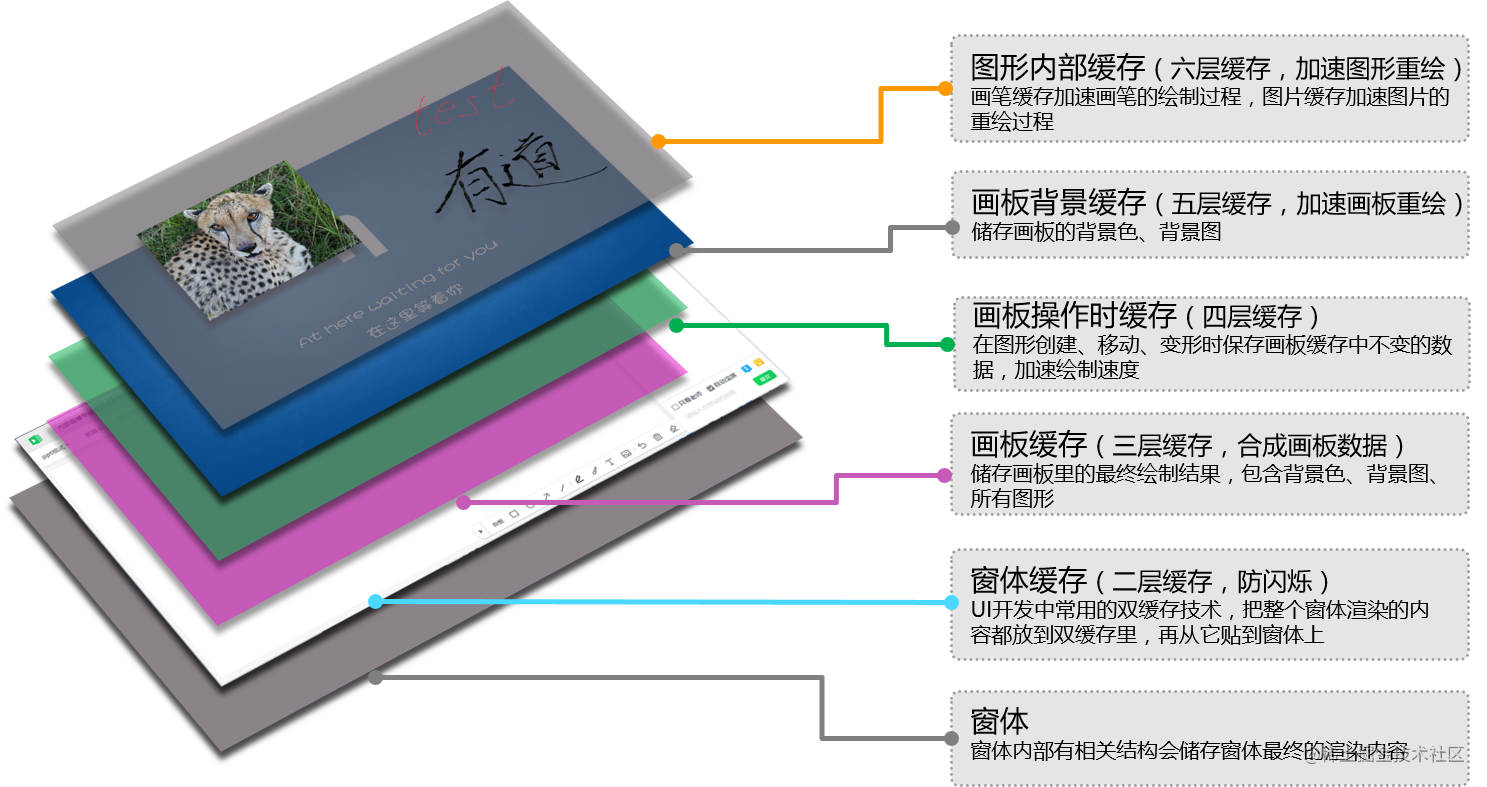 画板支持的特性越复杂,就越需要消耗更多的 CPU。为了节省 CPU 资源,我们搭配网易 Duilib 框架中的渲染引擎,设计了6层缓存机制,让画板在支持丰富功能的同时保证极低的 CPU 占用率。 画板多层缓存