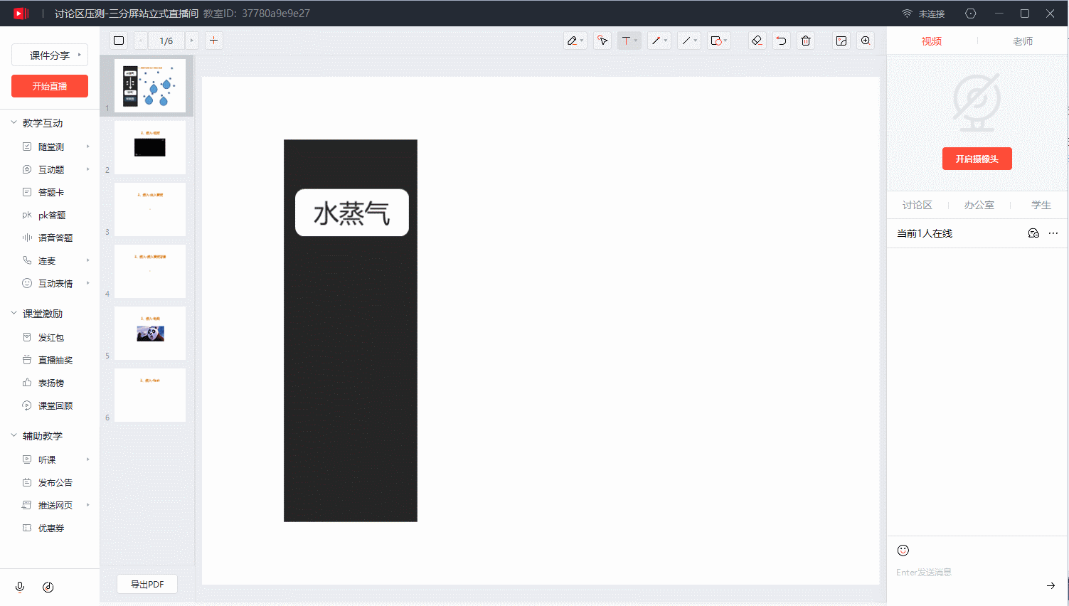 教师端的画板拥有丰富的功能:绘制各种图形图片、图形交互、书写文本、PPT解析、动画、导出 PDF、缩放等等。