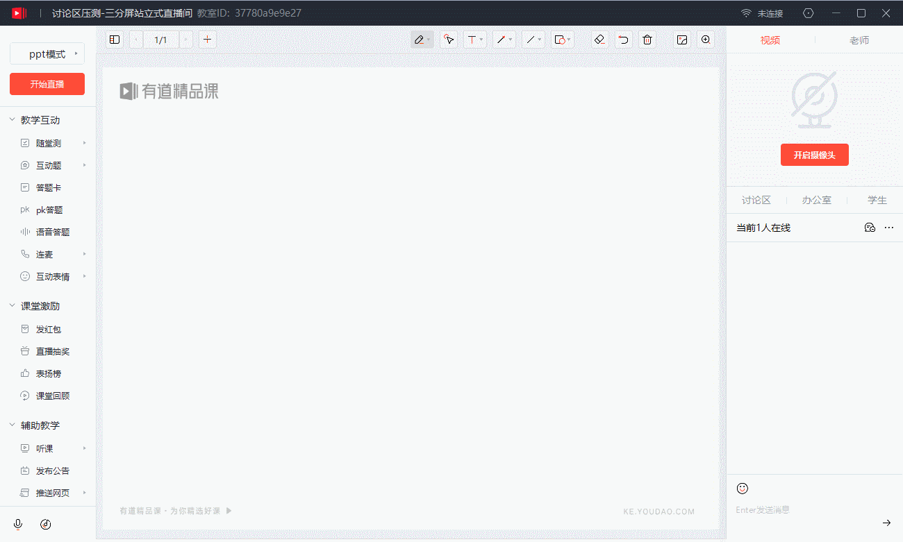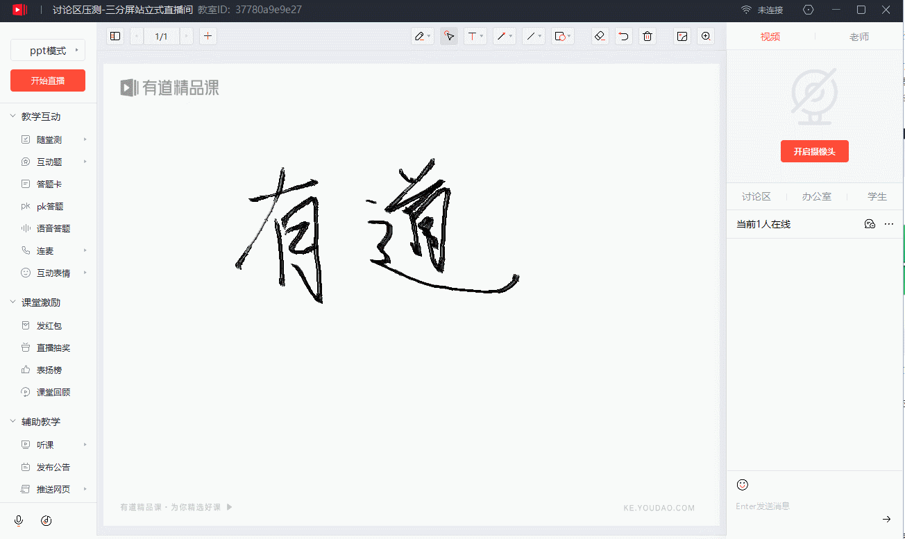 老师可以使用有道精品课教师端进行 PPT、PDF、桌面共享、iPad 投屏、视频播放等多种直播方式 。老师也可以把讲课过程中画板上的板书和课件导出为 PDF 分享给学生。