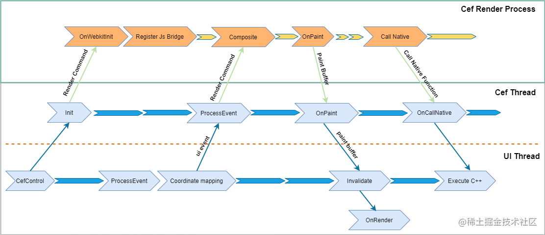 CEF 内部有完整的一套消息循环,我们将网易 Duilib 框架中的 base 线程模型与 CEF 消息循环组合在一起。同时封装CEF的离屏渲染模式(OSR)、窗口模式为网易 Duilib 中的控件 CefControl、CefNativeControl,让 CEF 的 WebView 能力完整的嵌入到网易 Duilib 中。最后我们封装了js与native的通信能力 JsBridge。