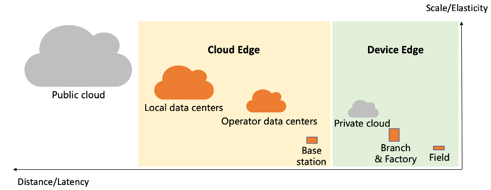 或区域的数据中心、由电信和网络运营商运行的运营商数据中心,以及用作网络接入点的基站,例如 5G 基站。位于基站的边缘也称为“多接入计算边缘”,简称为 MEC。云边缘通常由云服务商拥有和运营。图1中,从左向右,客户应用程序或最终用户访问云边缘的延迟依次降低;从上向下,其规模和资源弹性逐渐减小。