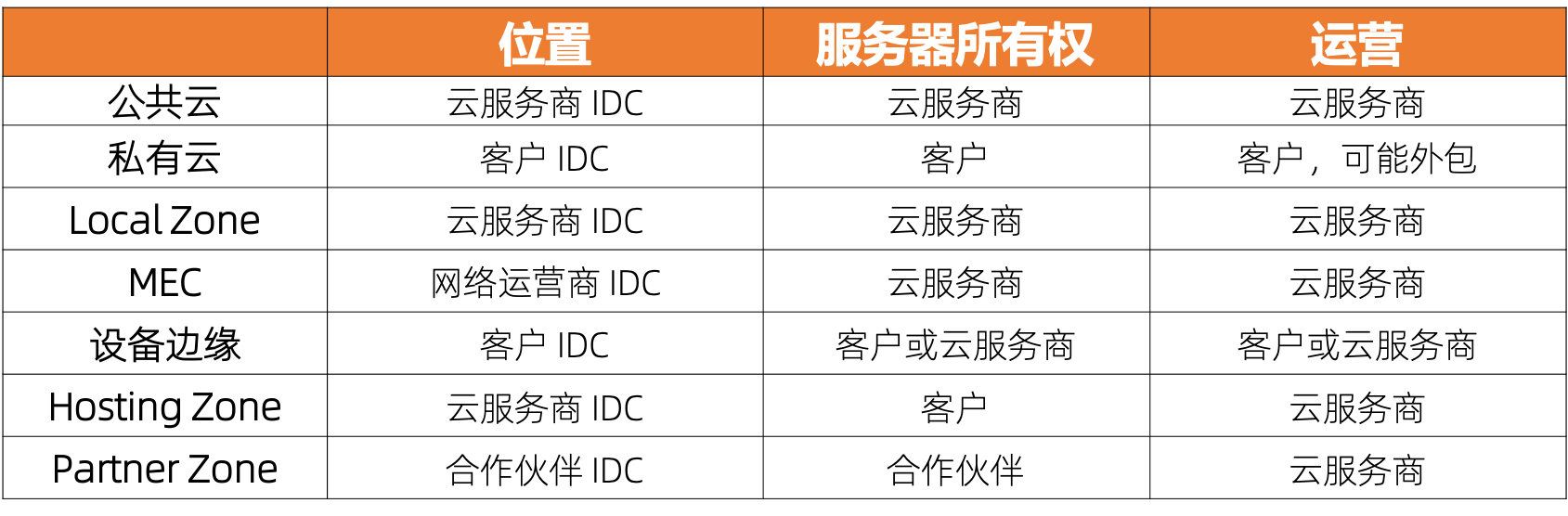 私有云和设备边缘给了客户完全的所有权和控制权,而在公共云和云边缘,客户虽然失去了所有权和控制权,但避免了运营和运维的复杂性。在位置、所有权和运营主体这些维度上,还有其他一些有趣的组合。例如,AWS Outposts 明显提供了其中一个新组合,设备由云服务商拥有和运营,但部署在了客户的数据中心。