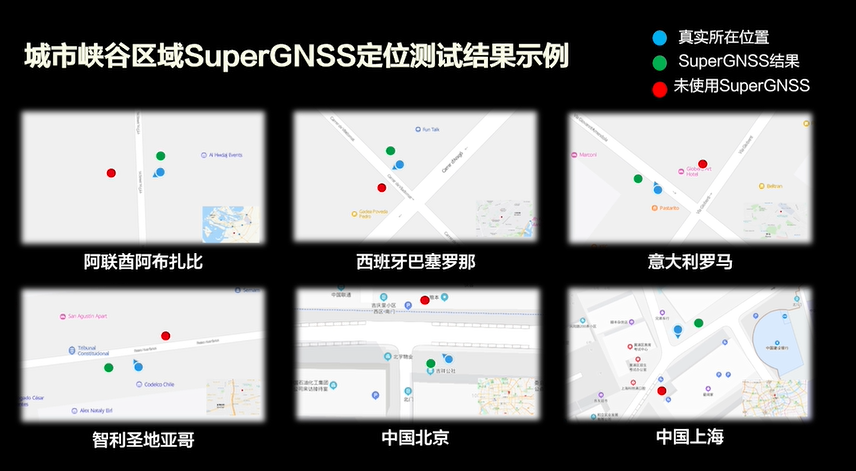 除此以外,我们在全球做了外场测试,这是一些典型城市的测试结果。有阿联酋的阿布扎比,欧洲的巴塞罗那、罗马,还有南美的智利圣地亚哥,以及中国的北京上海。这个图中蓝色点代表用户的真实位置,绿色点是我们SuperGNSS的定位结果,红色是没有用到我们技术的定位结果。从这几个图中来看,我们的定位都是非常精准的。