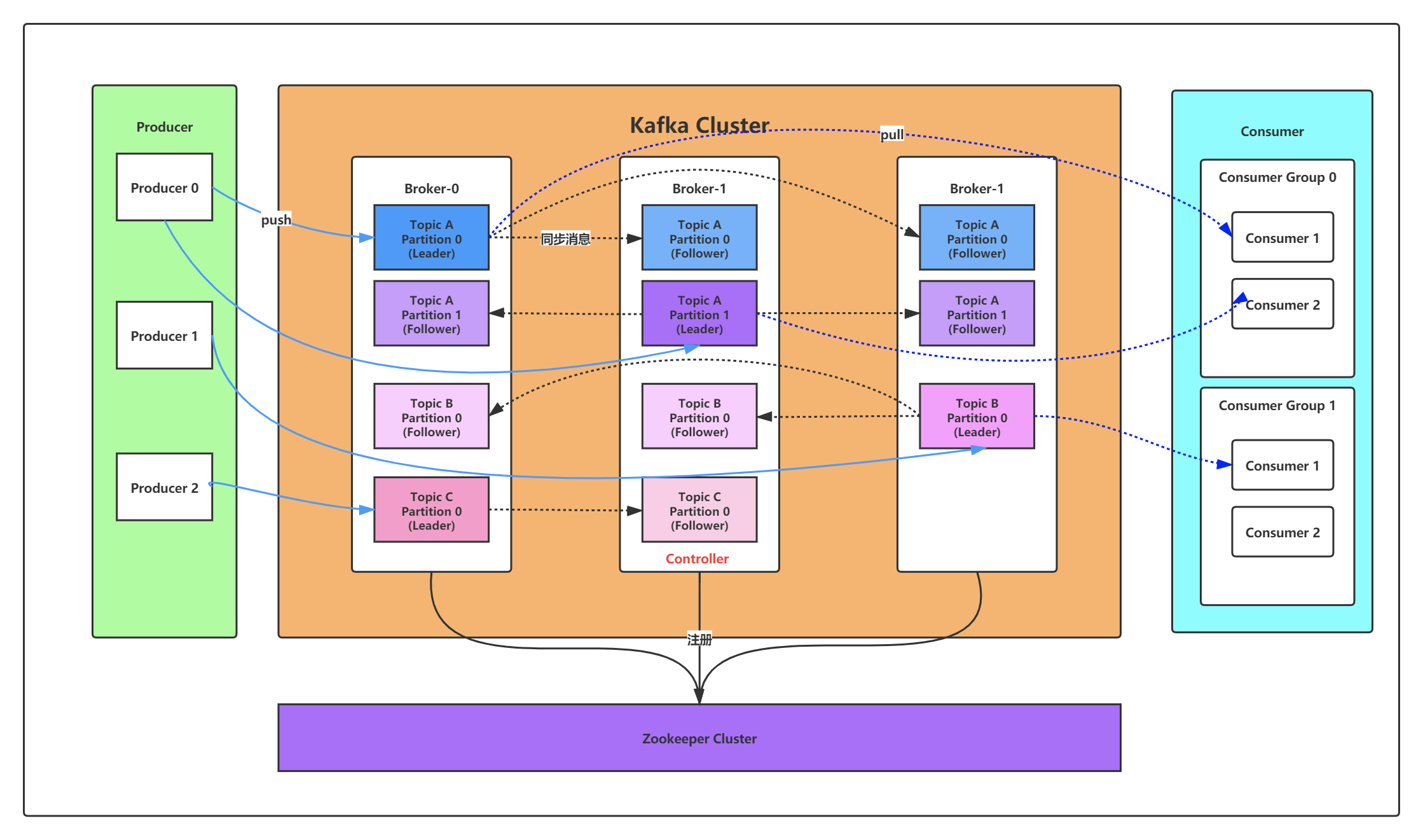 - Partition:分区,物理概念,一个Topic可分为多个分区,每个分区内的消息是有序的;个人理解与RocketMQ中的Queue概念相似