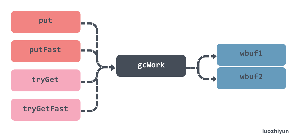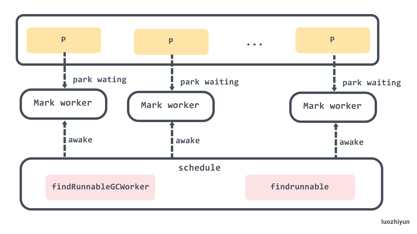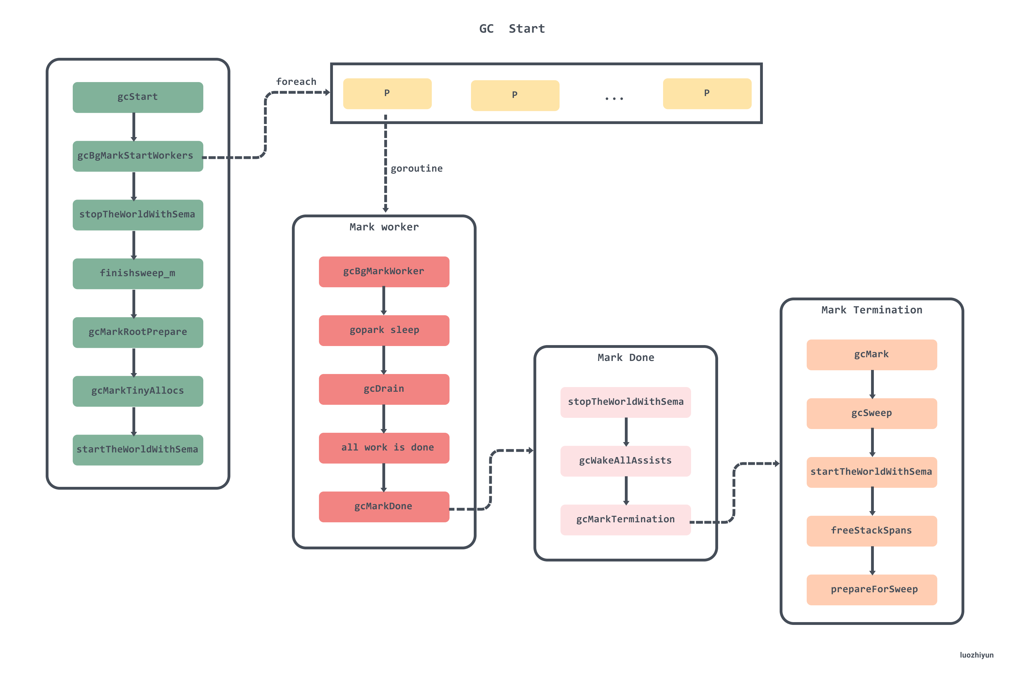 - GC 会使用分布式终止算法(distributed termination algorithm)来检测何时不再有根标记作业或灰色对象,如果没有了 GC 会转为mark termination(标记终止);