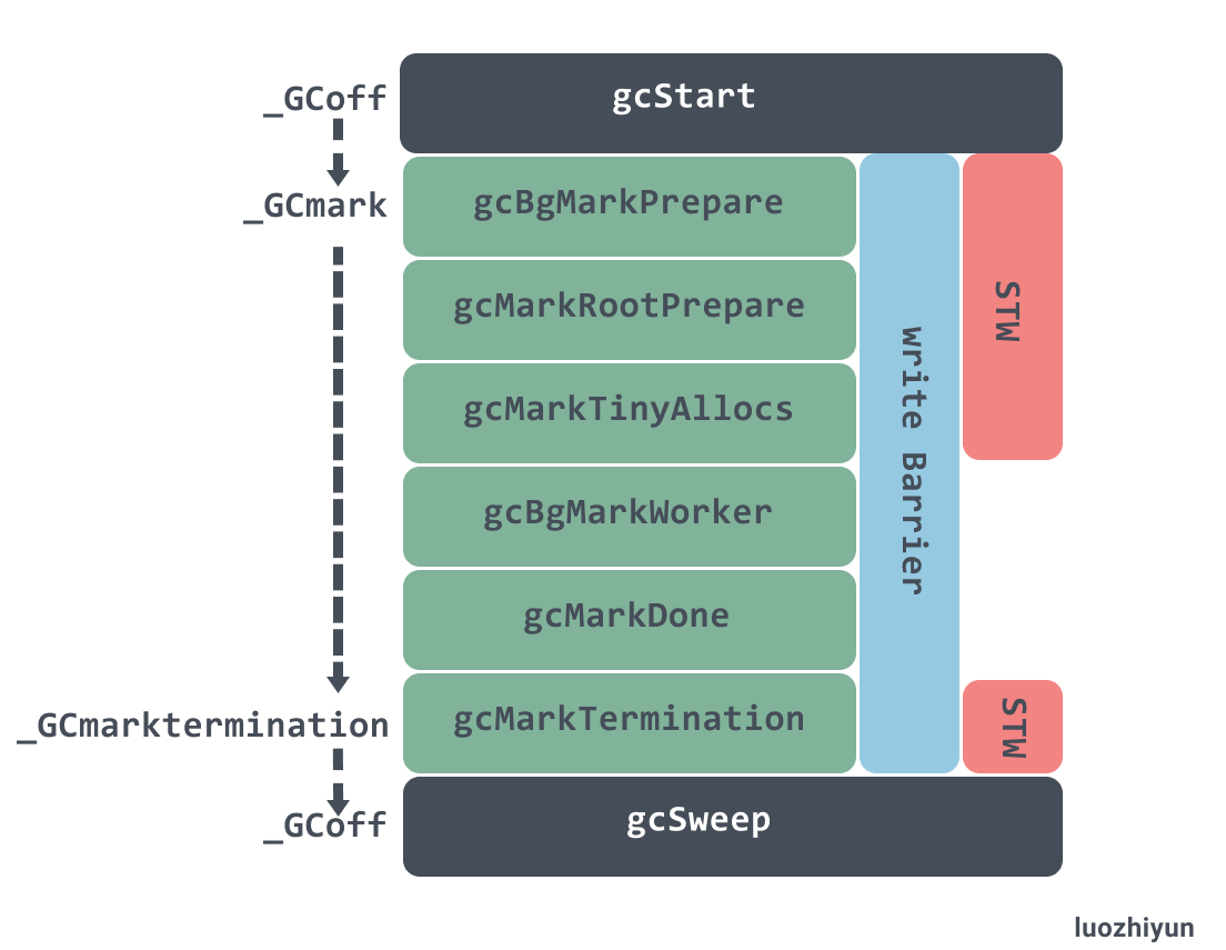 _GCoff,初始化清理状态并关闭 Write Barrier(写入屏障); - 恢复程序执行,从此开始新创建的对象都是白色的;