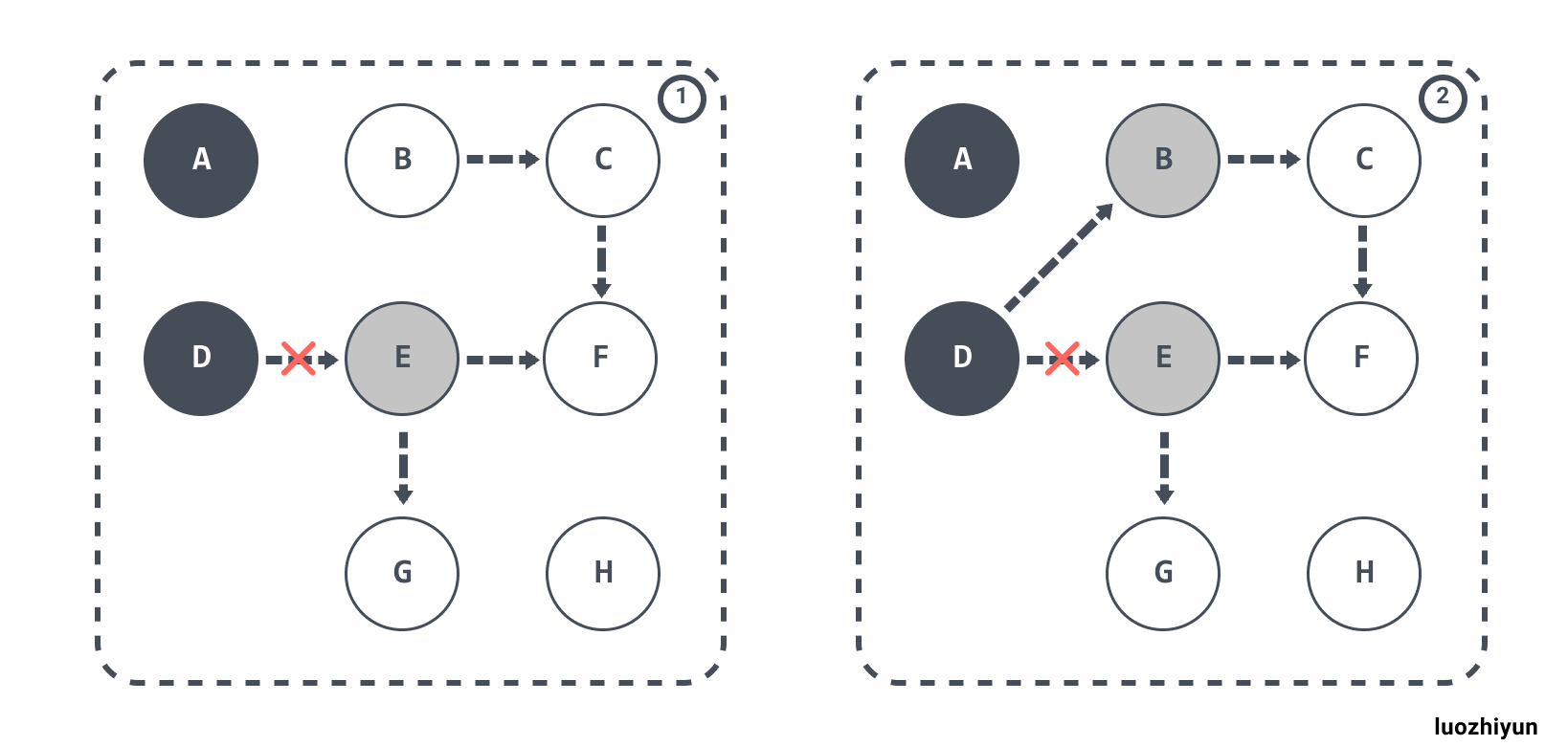 如下,根对象指向的 D 对象标记成黑色并将 D 对象指向的对象 E 标记成灰色;如果 D 断开对 E 的引用,改成引用 B 对象,那么这时触发写屏障将 B 对象标记成灰色。