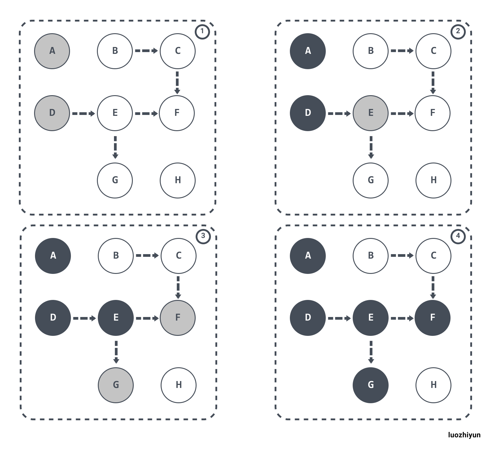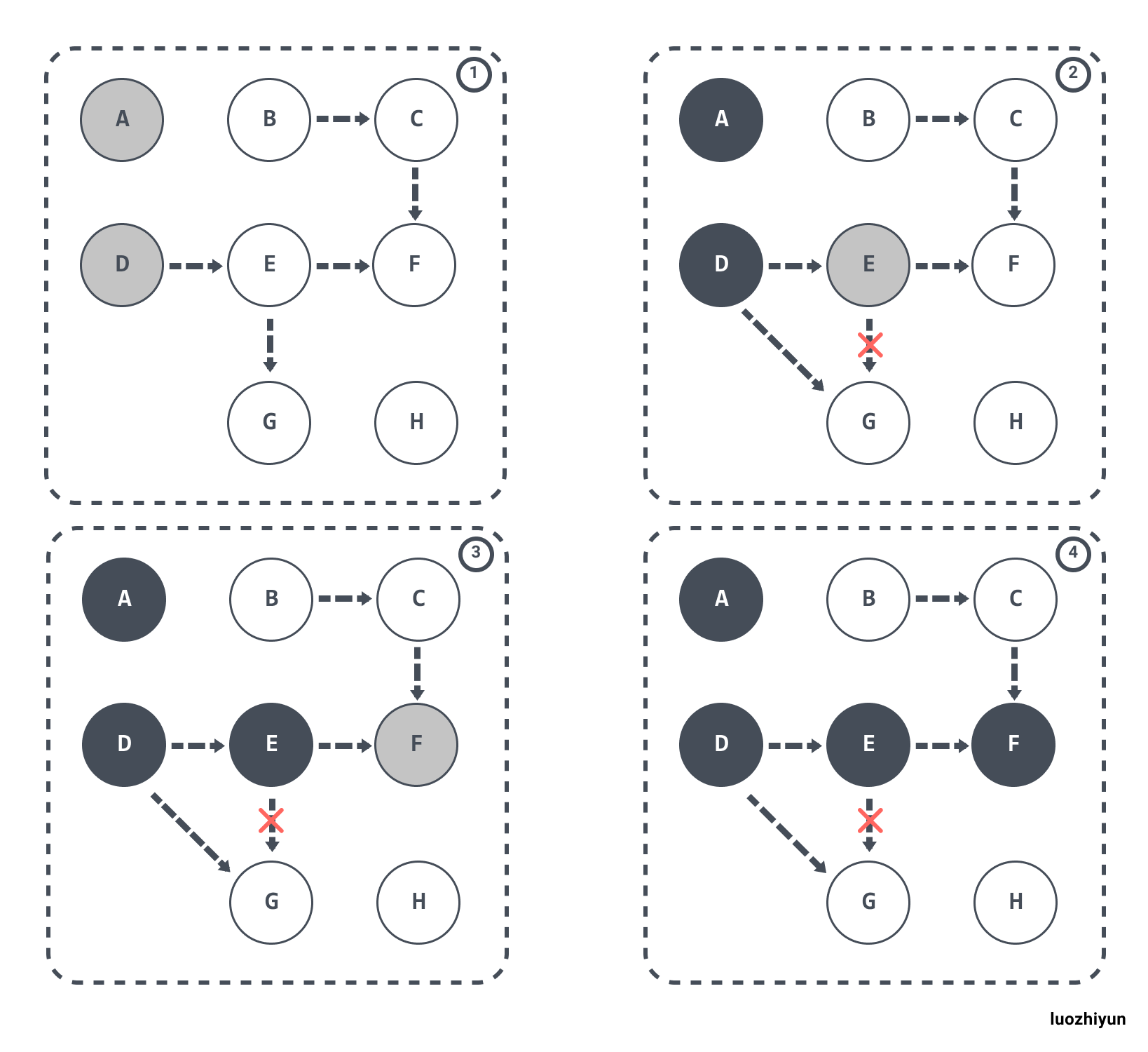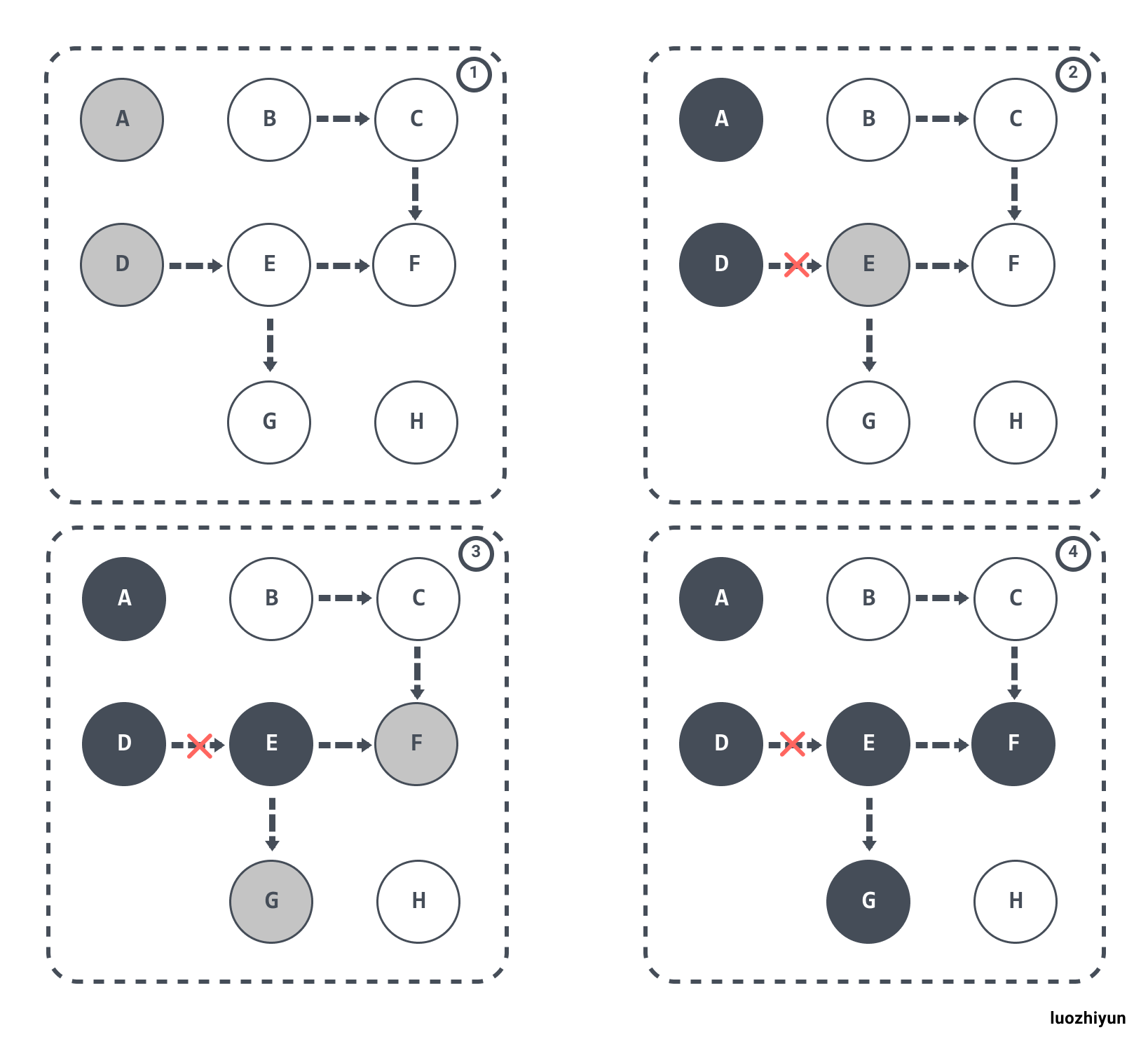 - 重复步骤2,直到没有灰色集合可以标记为止;