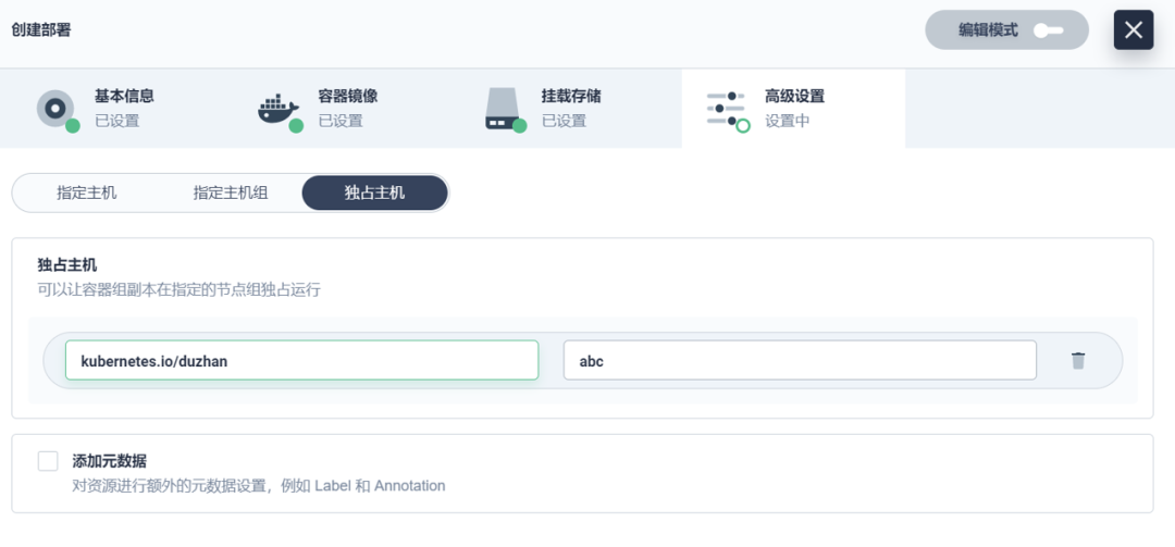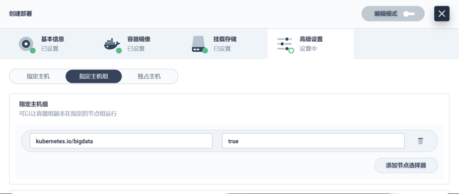 在调度策略方面,因为涉及到比较敏感的后台数据,我们本来打算通过 Yaml 的方式来做。但是后面还是决定通过 KubeSphere 的高级设置页面来实现。我们简单加了一些页面的元素,把指定主机、指定主机组、独占主机的功能,通过表行的形式去配置。我们现在用得特别好的是指定主机组和独占主机这两个功能。