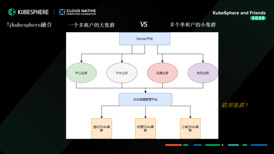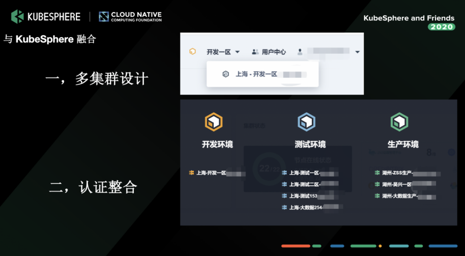 当时我们基于多集群设计,以 KubeSphere 2.0 为蓝图作改造。在开发、测试和生产者三个环境中切,我们在每一个集群里都部署一套 KubeSphere,当然有一些公共的组件我们会拆出来,比如监控、日志这些。