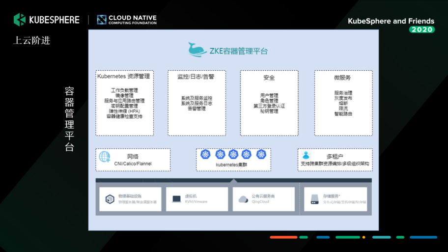 在选型的时候,我们首先接触的就是 KubeSphere。当时我通过检索发现了 KubeSphere,然后进行试用,发现界面和体验等方面都非常棒。试用一周之后,我们就决定,使用 KubeSphere 作为中通容器管理平台 ZKE 的建设方案。我印象中我们当时从 KubeSphere 2.0 版本就开始采用了。同时,在 KubeSphere 的影响之下,我们很快就跟青云达成合作协议,直接使用青云的私有云产品来建设中通物流的 IaaS,而 KubeSphere 作为上层的容器 PaaS 平台承载微服务运行。