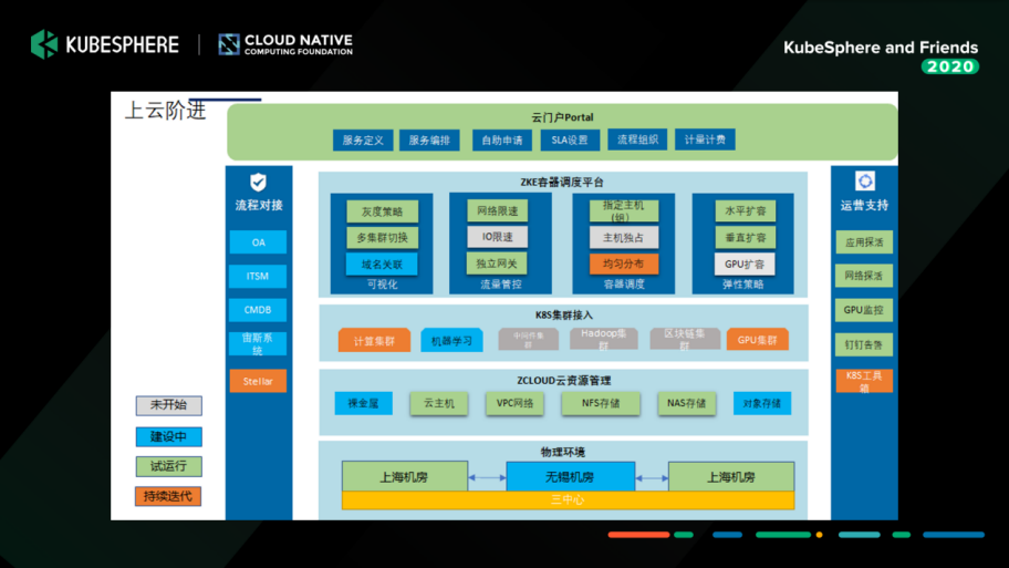 因为我们介入的时候,中通整个业务的开发已经非常多、非常庞大了。我们有一个非常成熟的 DevOps 团队,把发布的 CI/CD 的需求做得非常完善。所以我们介入的话只能做 IaaS 和 Kubernetes 的建设。