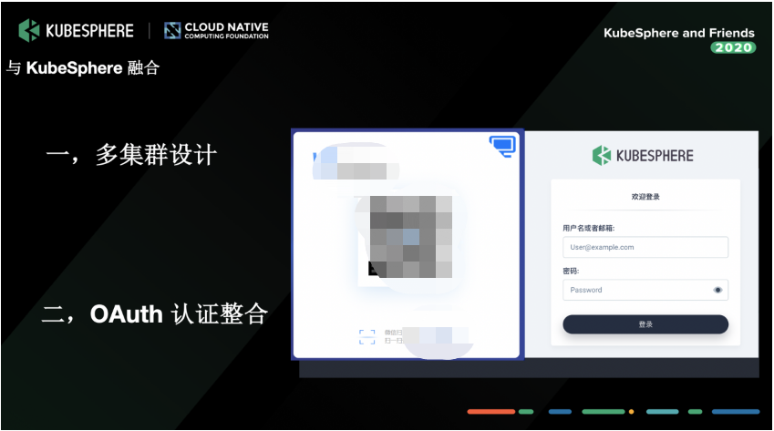 我们整合的时候,KubeSphere 团队给了我们非常多的帮助,由于 KubeSphere 2.0 版本只支持 LDAP 对接的方式,而对接 OAuth 的计划放在3.0版本里,后来 KubeSphere 团队帮我们整合到 2.0,单独打了一个分支。因为我们公司内部的 OAuth 认证还有自定义的参数,我们开发改造后,通过扫码认证的方式很快就整合进来了。