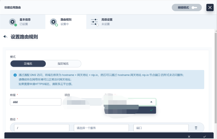 KubeSphere 是有独立网关的概念的,每一个项目下都有一个单独的网关。独立网关满足了我们的生产需求(因为希望生产走独立网关的方式),但在开发测试有一个泛网关的需求,因为我们希望更快响应服务。所以我们做了一个泛网关,起了一个独立网关,所有开发、测试、域名通过泛域名的方式直接进来。这一块配置好,通过 KubeSphere 界面简单编排一下,基本上我们的服务就直接可以访问。