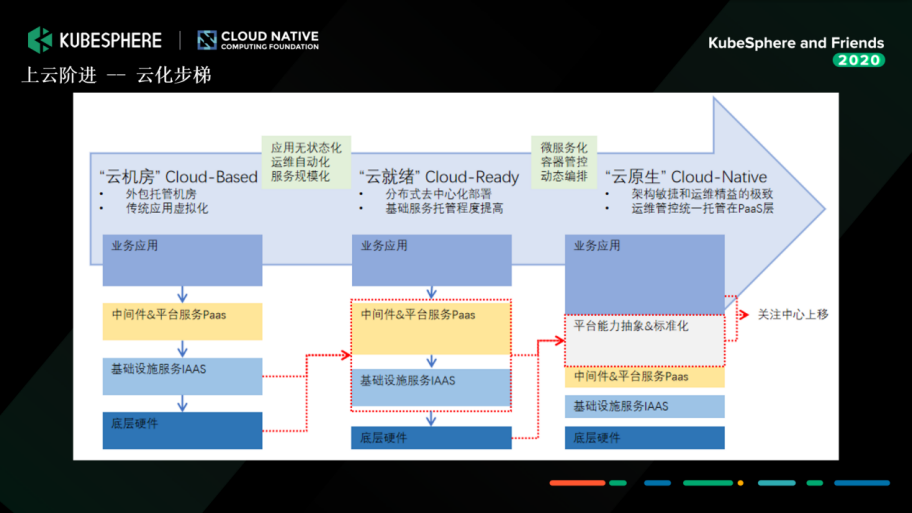 通过调查,我们认为云化改造可以分为三步:云机房、云就绪和云原生。