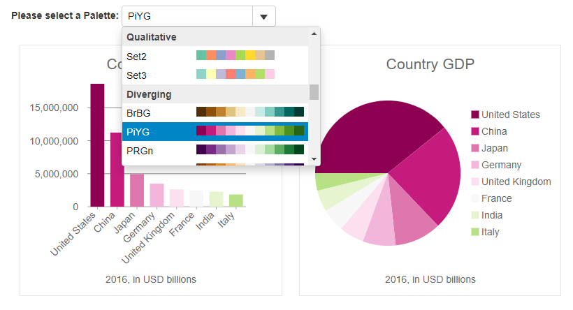 WijmoJS 的第二个新功能是图表动态调色板,用于在地图和图表中创建漂亮的分级统计地图。