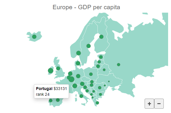 FlexMap可用于创建气泡地图。气泡图在地图上显示的气泡大小取决于数据的值(较大的值=较大的气泡)。