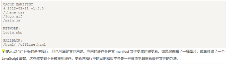 一旦文件被缓存,则浏览器会继续展示已缓存的版本,即使您修改了服务器上的文件。为了确保浏览器更新缓存,您需要更新 manifest 文件。
