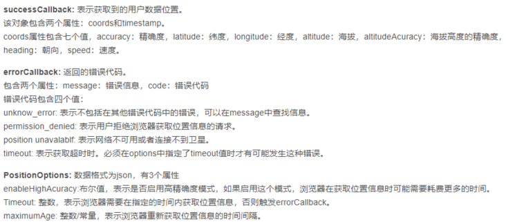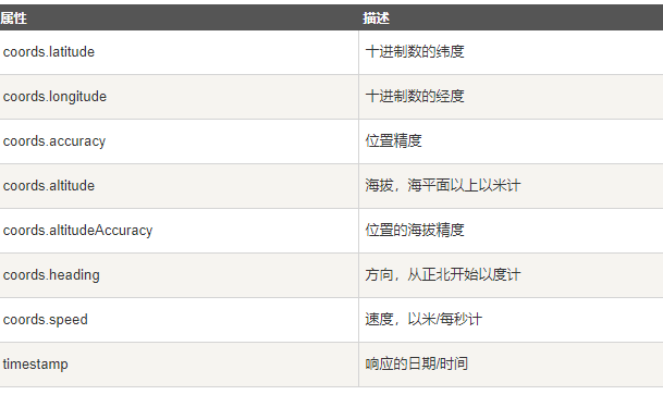getCurrentPosition() 方法返回对象。始终会返回 latitude、longitude 以及 accuracy 属性。如果可用,则会返回其他下面的属性
