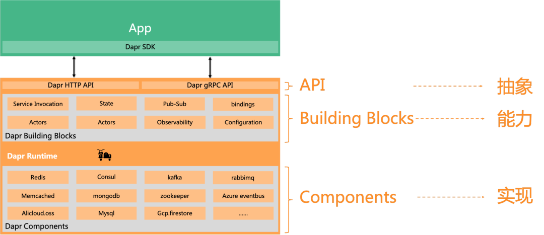 Dapr API 提供对分布式能力的“抽象”,对外暴露 Building Block 的能力