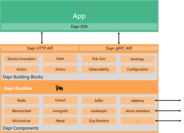 Dapr API:Dapr 提供两种 API,HTTP1.1/REST 和 HTTP2/gRPC,两者在功能上是对等的。