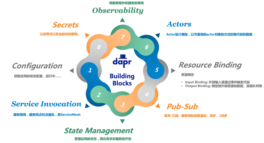Dapr Building Blocks:翻译为构建块,这是 Dapr 对外提供能力的基本单元,每个构建块对外提供一种分布式能力。