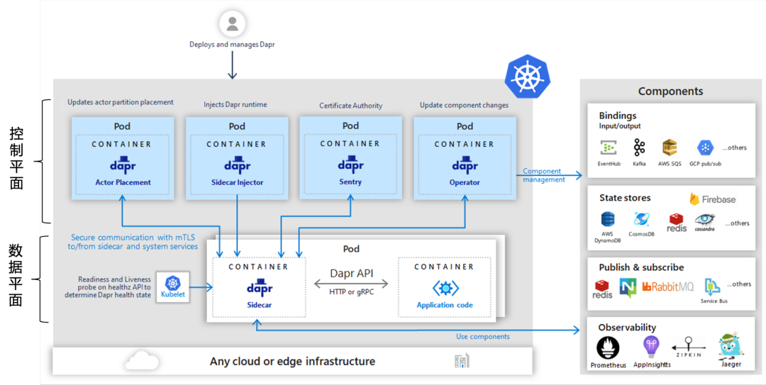 和 Service Mesh 的架构类似,Dapr 也有控制平面的概念: