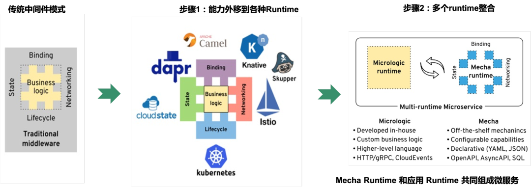 Multi-Runtime 的理论推导大体是这样的——基于上述四大类需求,如果效仿 Service Mesh,从传统中间件模式开始,那么大体会有下面两个步骤: