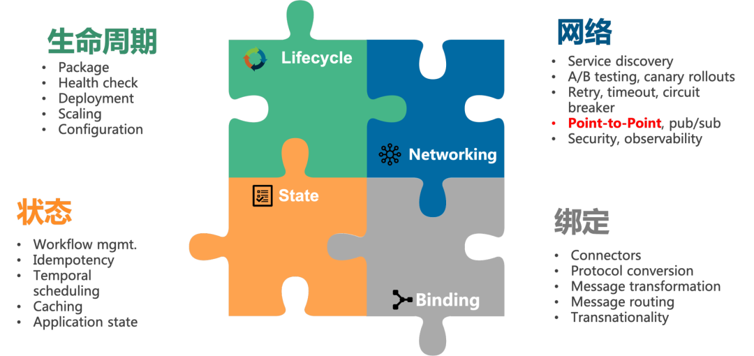 功能:Dapr 为应用提供各种分布式能力,以简化应用的开发。上面定义中提及的关键点有弹性、支持有状态和无状态、事件驱动。