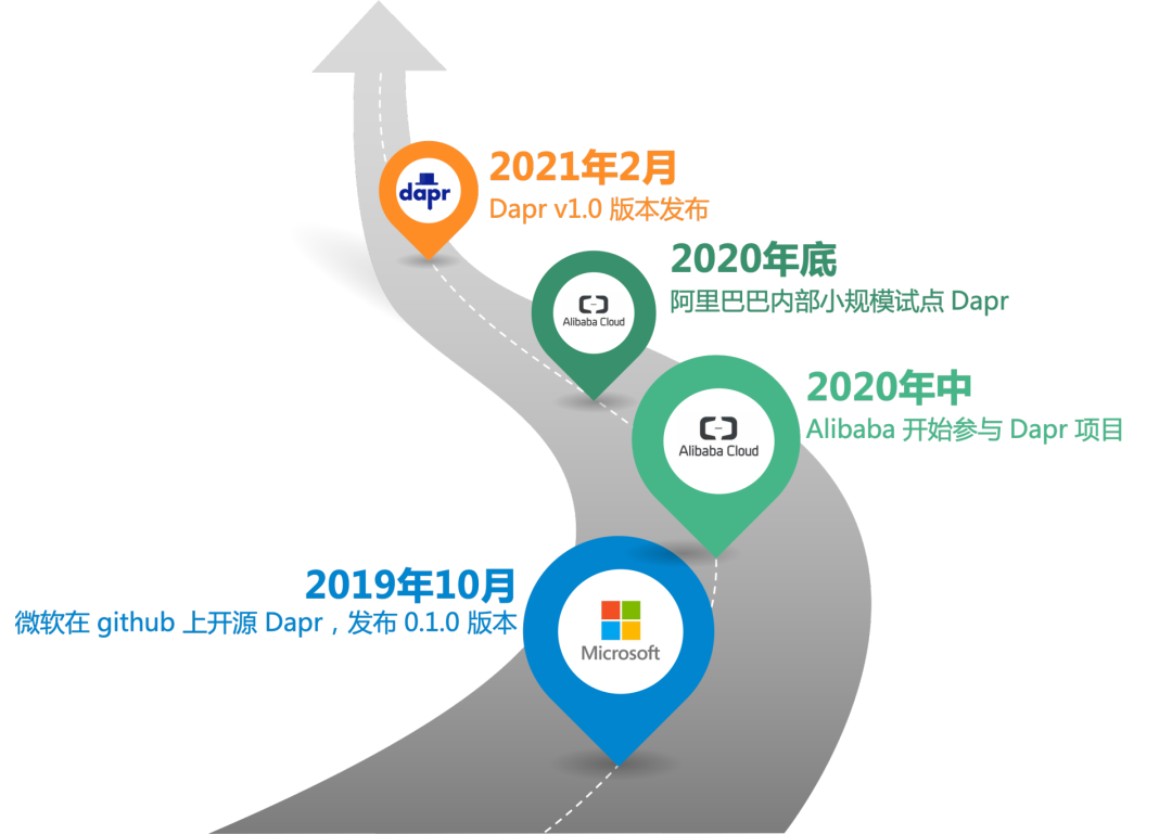 2020 年底:阿里巴巴内部小规模试点 Dapr,目前已经十几个应用在使用 Dapr 。