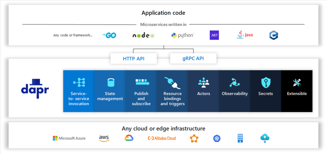 最下方是可以支持 Dapr 的云平台或者边缘网络,由于每个能力都可以由不同的组件来完成,因此理论上只要 Dapr 的支持做的足够完善,就可以实现在任何平台上,总是能找到基于开源产品或者基于云厂商商业化产品的可用组件。