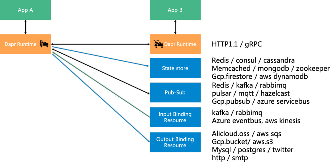 Dapr 的 Sidecar,除了可以和 Service Mesh 一样支持服务间通讯(目前支持 HTTP1.1/REST 协议和 gRPC 协议外,还可以支持到更多的功能,如 state(状态管理)、pub-sub(消息通讯),resource binding(资源绑定,包括输入和输出)。